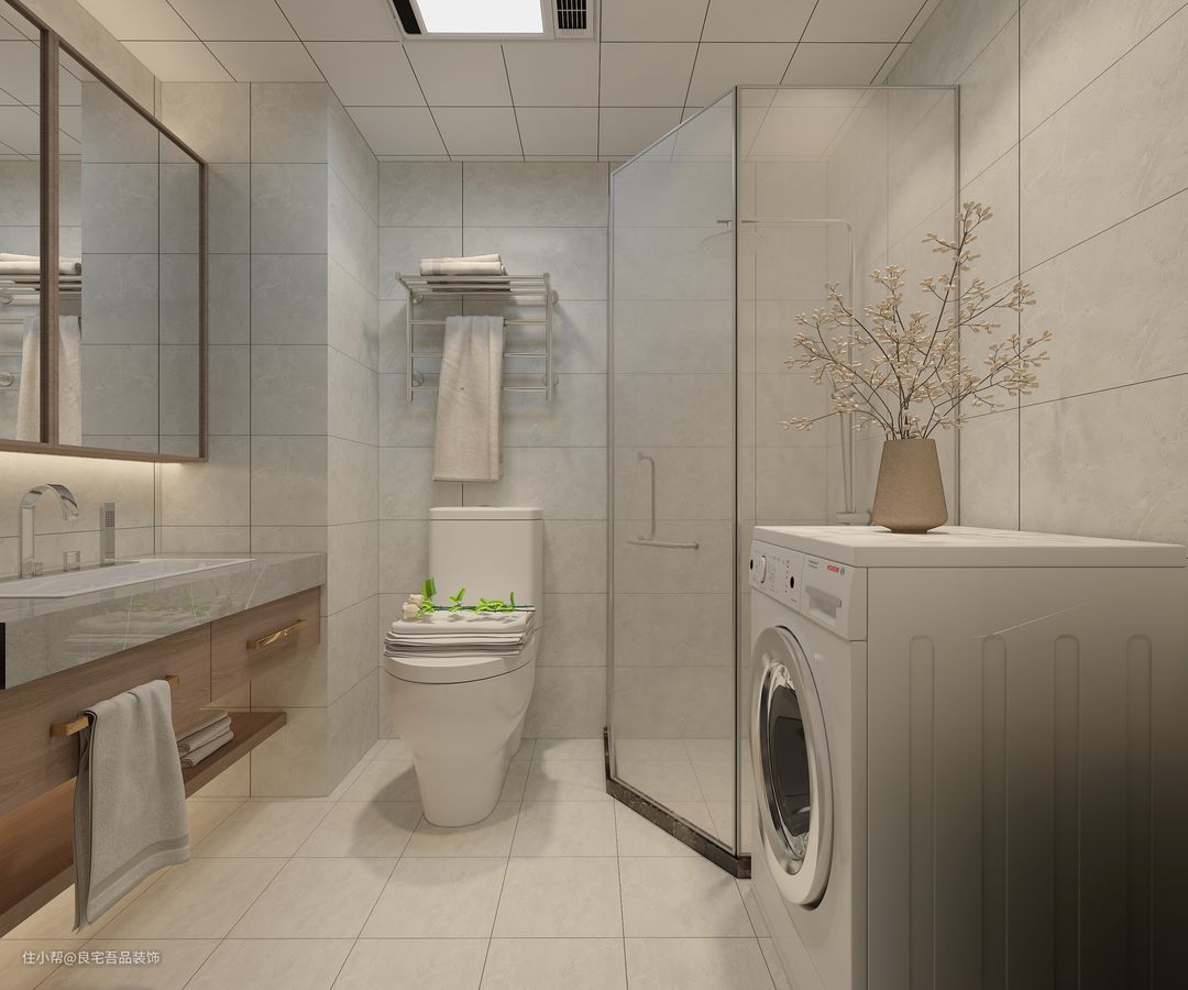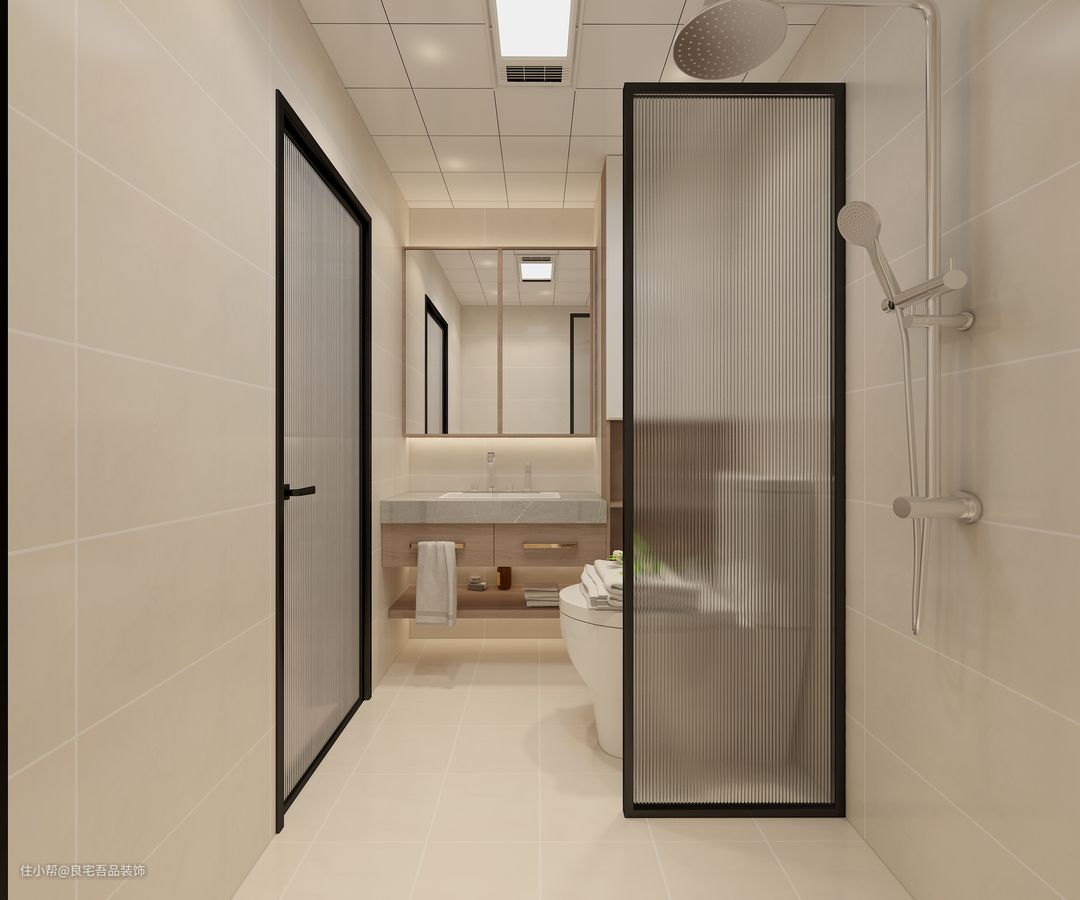 主卫和客卫都做了一个干湿分离设计,钻石型转角做了淋浴区,玻璃门进行隔断,洗澡水不会溅到马桶上,生活效率更高。客卫用一个长虹玻璃门做了隔断。