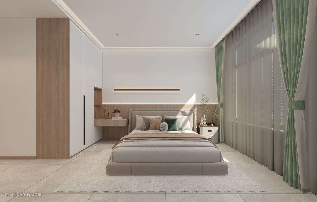 卧室整体色调也是白色和原木色,用原木板做了一个床头的半墙设计,整体看起来温馨简约。靠墙做了一个通顶柜,白色和原木色相搭配,清爽又实用。