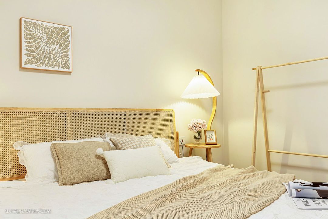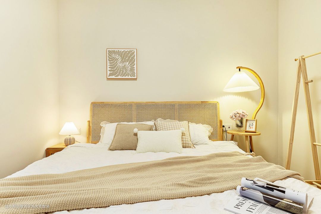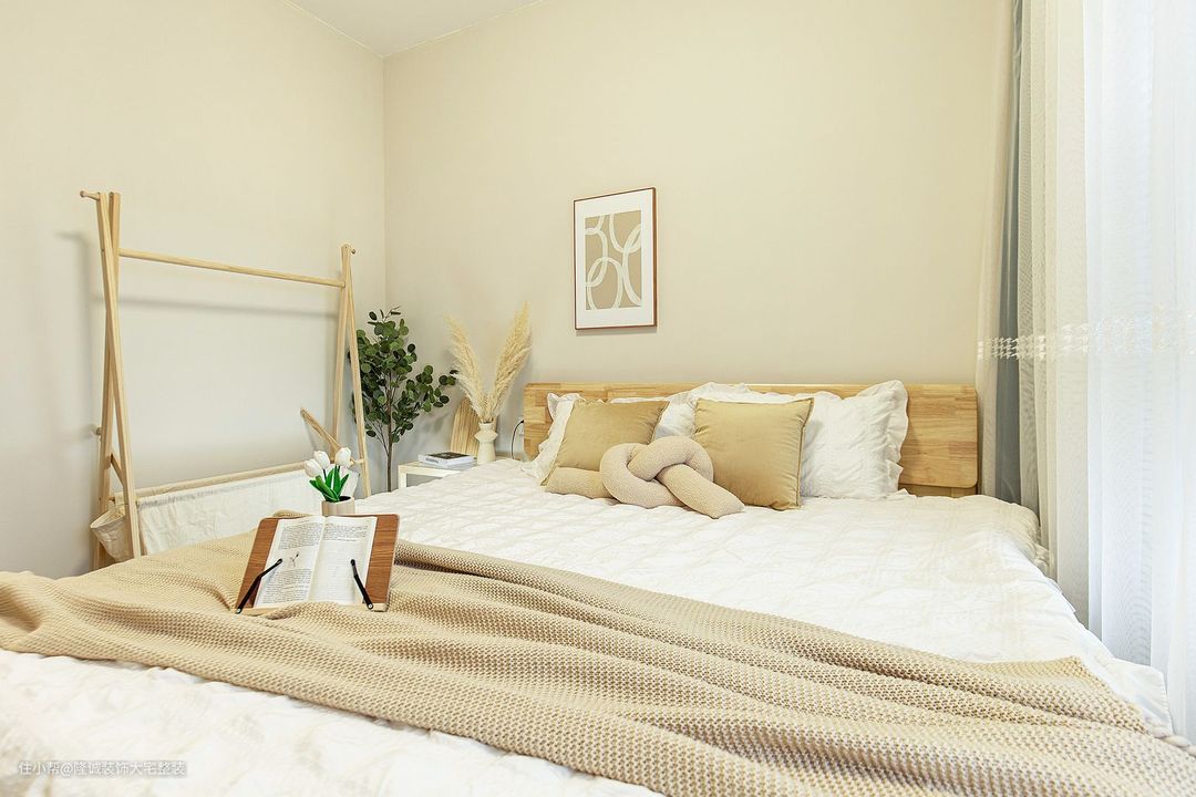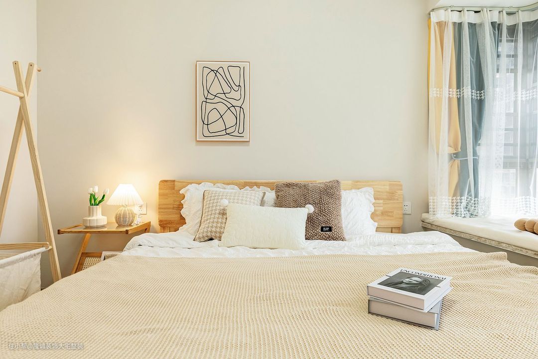 卧室的设计同样以奶油色为主调,搭配法式风格的床头背景墙和窗帘,营造出浪漫优雅的睡眠环境。同时,简约的家具和装饰也保证了空间的舒适性和实用性。