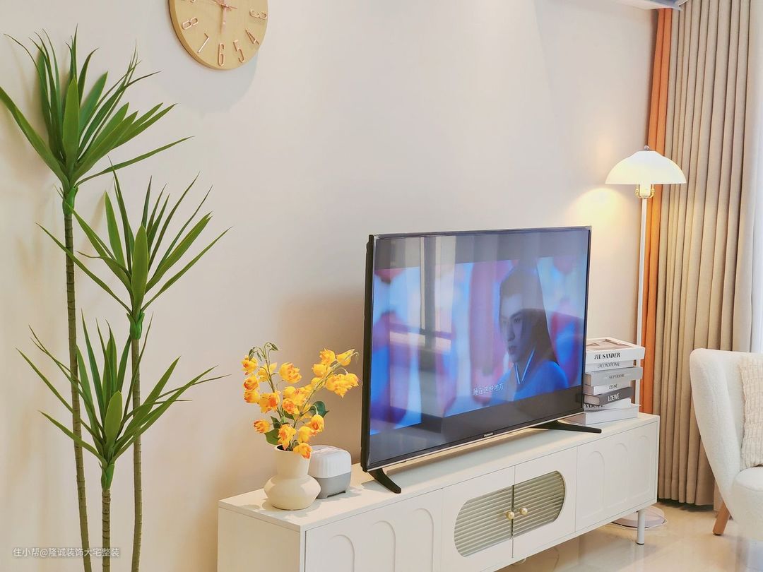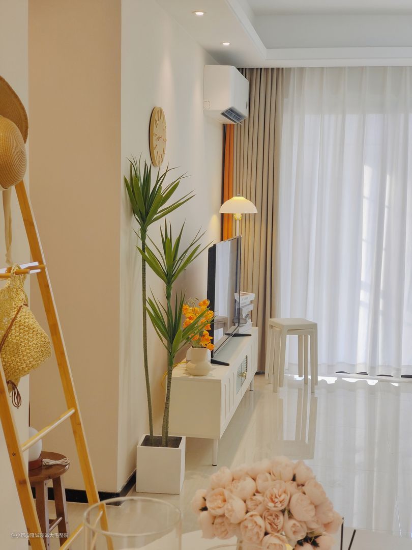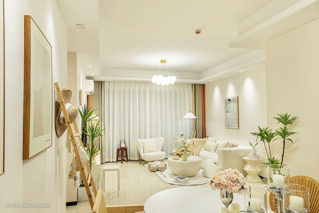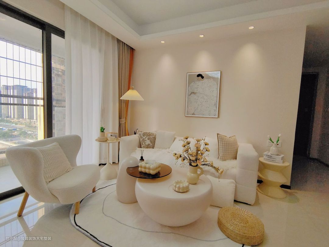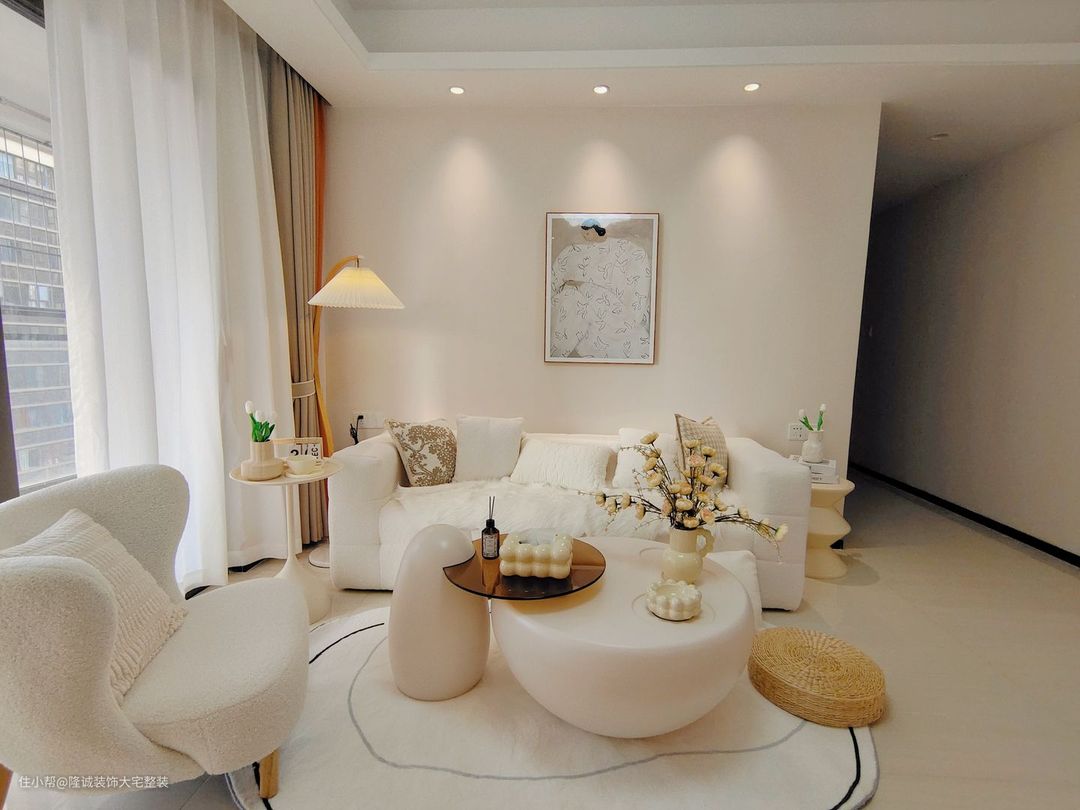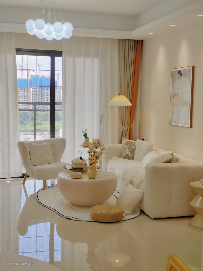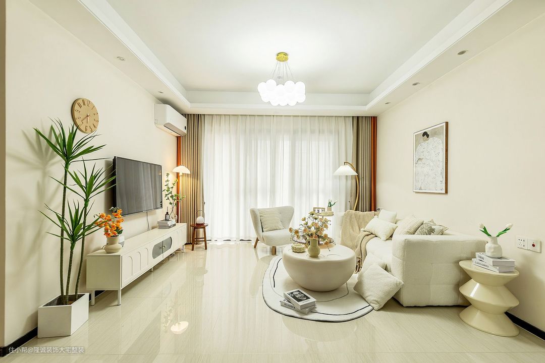 客厅作为家的核心区域,设计师采用了大面积的奶油色作为基调,搭配简约的家具线条和法式风格的装饰细节,如雕花壁灯、线条装饰等,营造出温馨而又不失高级感的氛围。