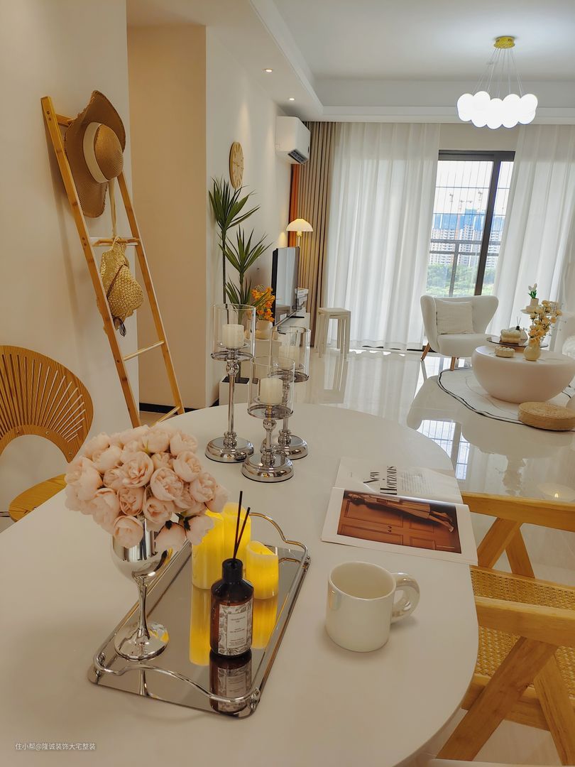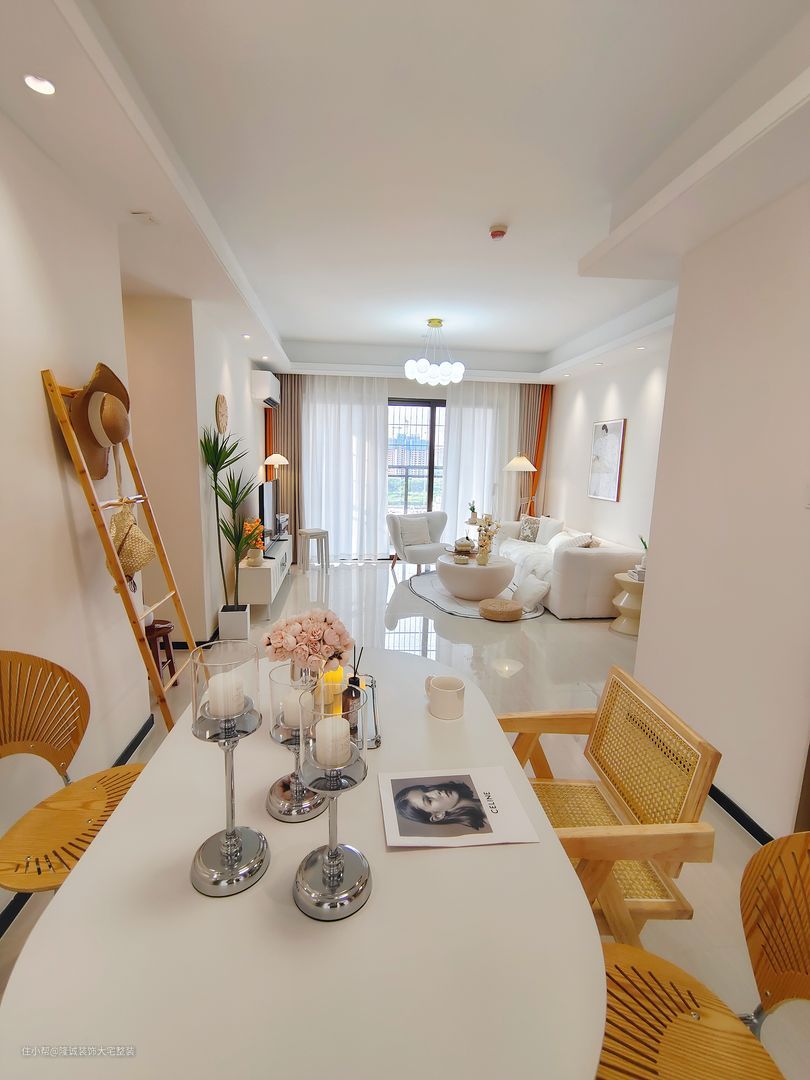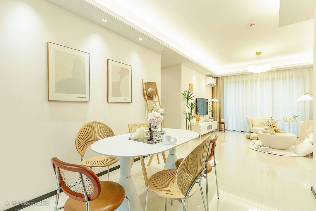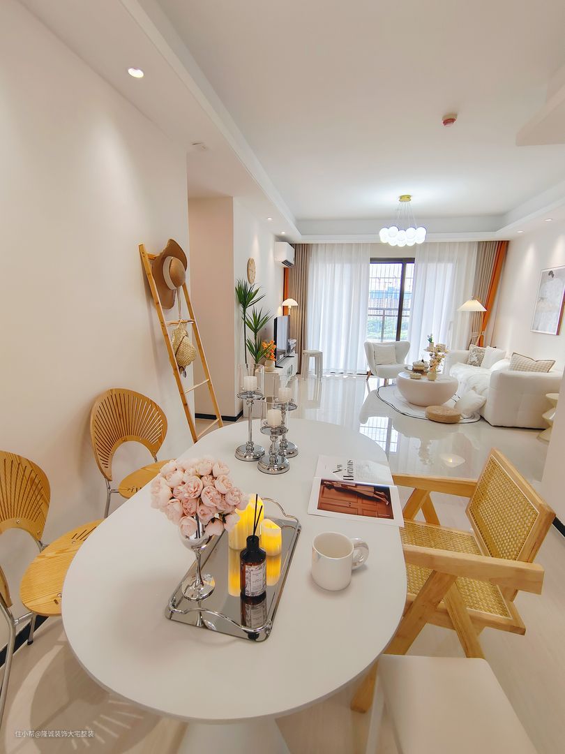 餐厅与客厅相连,设计师通过选用白色餐桌椅,搭配法式风格的吊灯和墙面装饰,打造出一个浪漫而舒适的用餐环境。