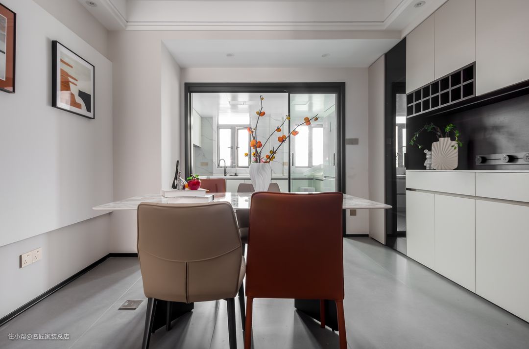 餐厅与客厅相连,延续了同样的简约风格原木色的餐桌和椅子,搭配白色的餐具,呈现出一种清新自然的感觉。在这里,与家人共享美食,谈论生活琐事,品味简约生活的美好