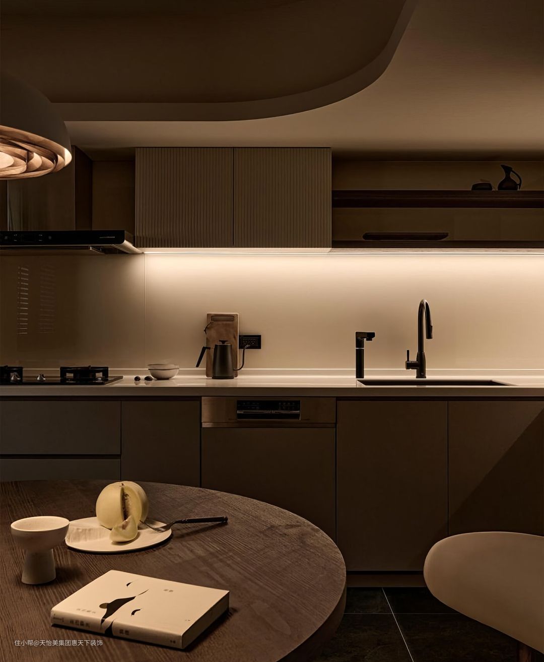 艺术涂料在无主灯的照射之下,一整个高级感厨房。利用墙体定制吊柜+低柜的组合设计,补充厨房的收纳,无手拉柜体简洁大方,靠考虑到空间的统一性,将部分家电内嵌入柜体。岛台的增设让餐厨的颜值提升不少,日常储物足够宽敞,可满足多人下厨需求。西式的中岛台可以作为功能分区的作用,日常还能缓解厨房操作台面的压力。
