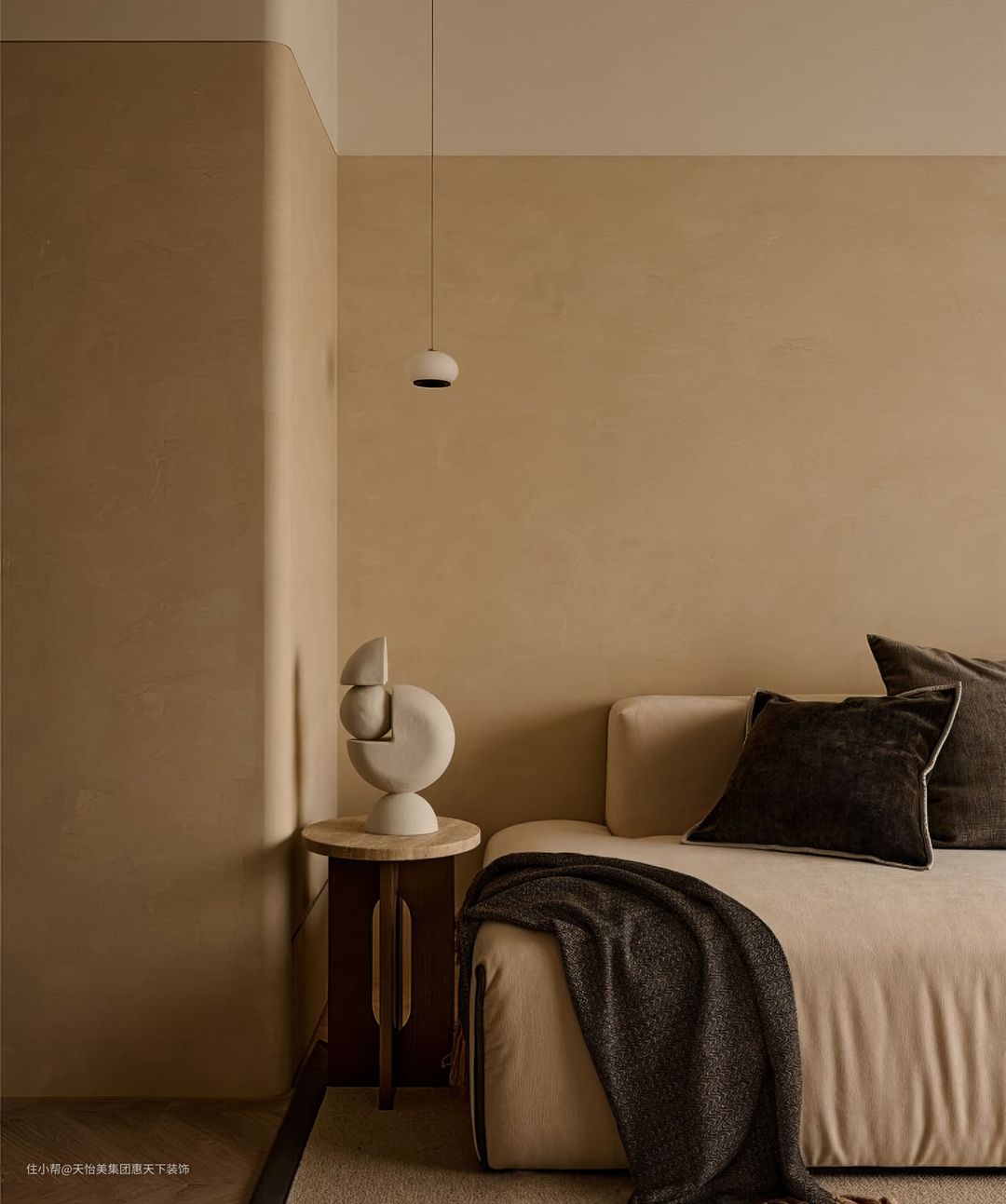 餐厨一体化设计,利用走廊空间将客厅与餐厨进行视觉分区,弱化区域边界的同时,却又保留了各自的独立性。空间微水泥打底,将自然、肌理、质感充分的体现。圆弧吊顶坐落在餐厅上方,不规则的弧形弱化空间尖锐感,餐桌+岛台一体化设计,让餐厅在看似简洁的线条之下,暗藏着丰富材质带来的多元化视觉感受。吊灯将就餐氛围感拉满。