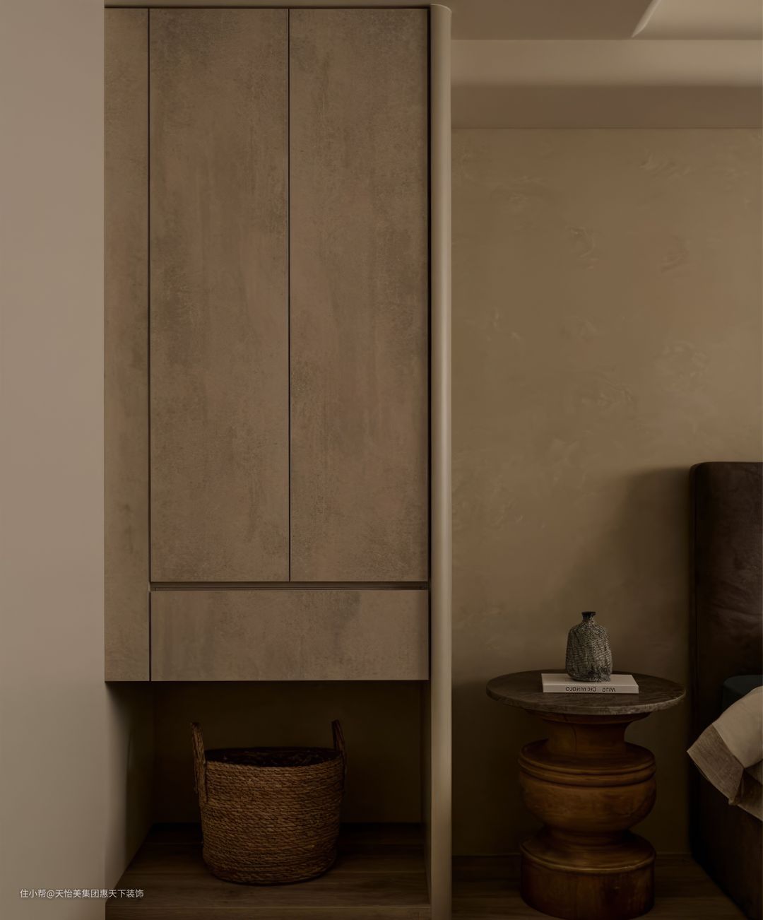 主卧没有过于复杂的装饰,主要根据业主的休憩需求为主,以温馨自然为睡眠空间的主题,可以保证空间的舒适度,缓解工作带来的疲劳感。艺术漆和无主灯的双重结合,搭配绿植以及艺术摆件点缀,让整个卧室充满温馨质朴的感觉。阳台的圆拱门洞与室内圆弧设计形成呼应性,床头两侧背景墙做了不同的储物区,结合床尾预留了简约的储物柜,推拉门为主节省空间使用面积。