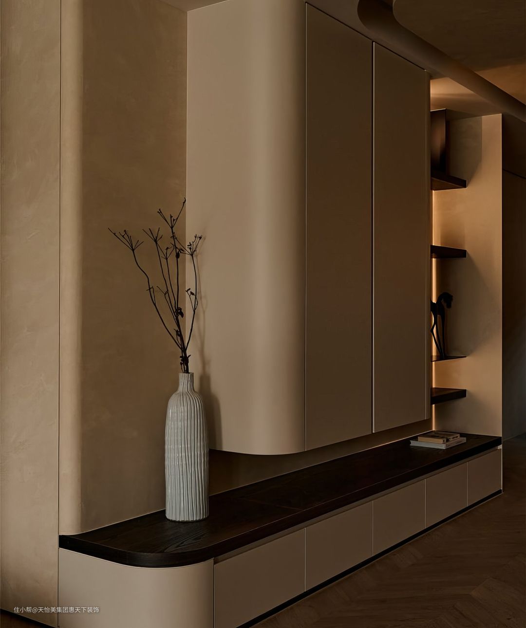 入户作为空间的第一眼,也是尤为重要的,考虑到空间的美观性与整洁性,一侧的背景墙做定制柜,为了避免过多的棱角,吊柜底部用圆弧弱化,一定程度给空间增加不少柔美感。空间以简洁明快的风格为主,大面积浅色的柜体,功能性和美观性并重。无手拉的通顶储物柜,满足入户的收纳需求。结合黑色烤漆面板的置物架,把门厅的自然感营造出来,看似简约却不失质感。
