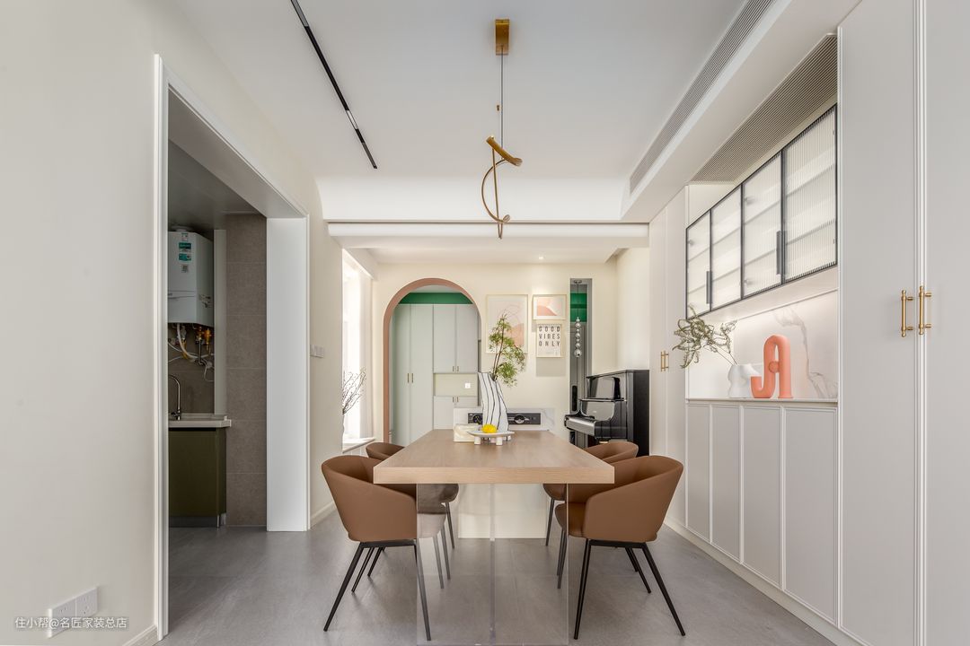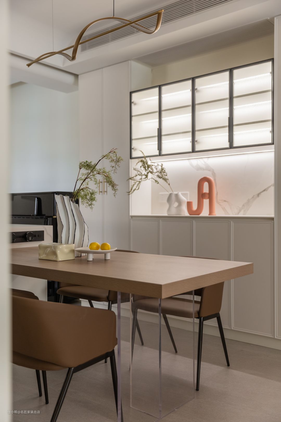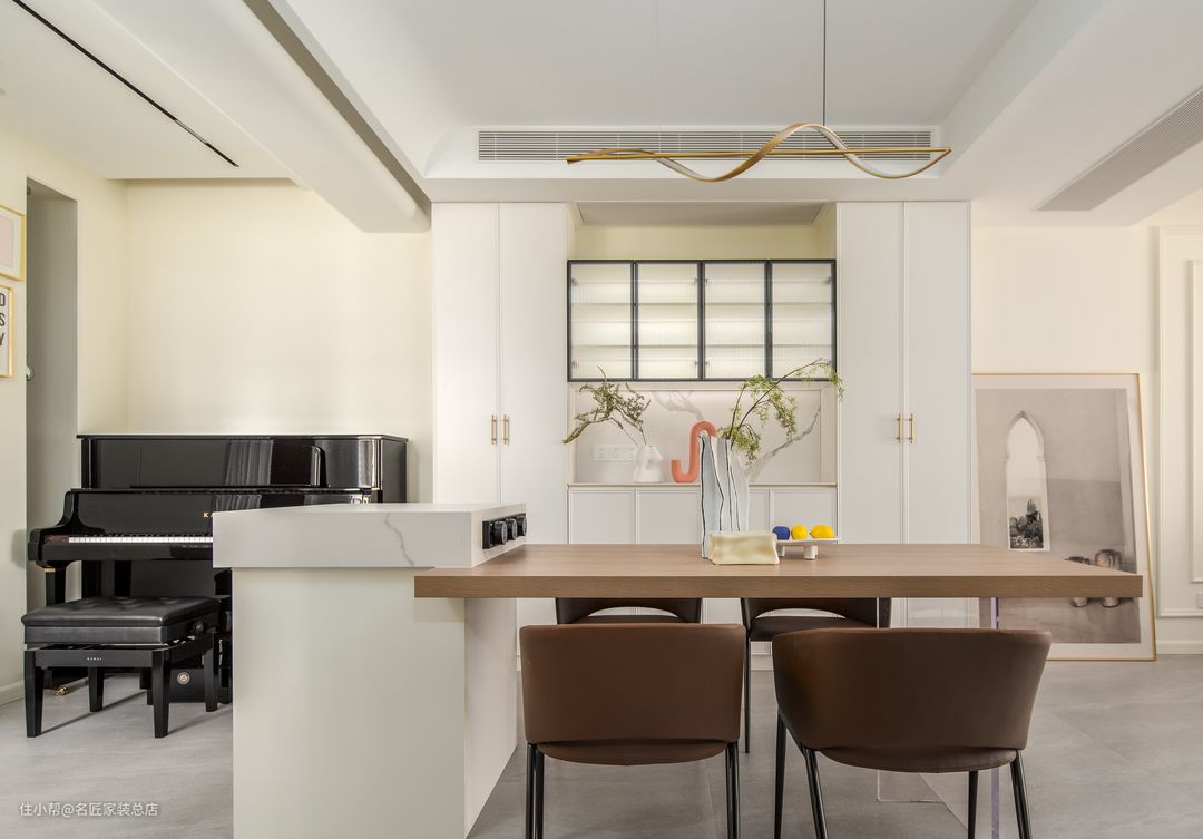 餐厅与客厅相连,延续了暖色调的设计。原木质的餐桌搭配舒适的餐椅,一种自然、温馨的氛围。在这里,你可以与家人共进美食,享受美好的用餐时光。餐厅的墙上挂着一幅精美的挂画,为整个空间增添了气息。