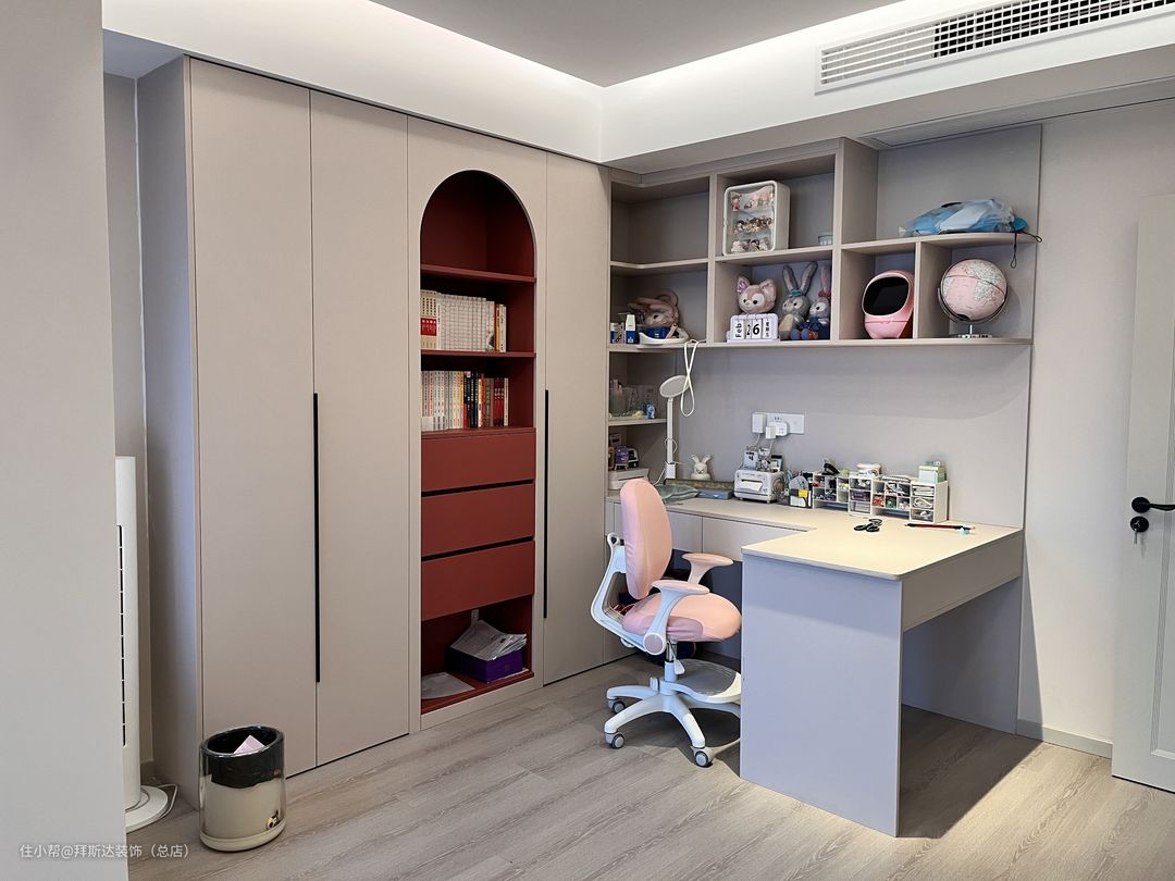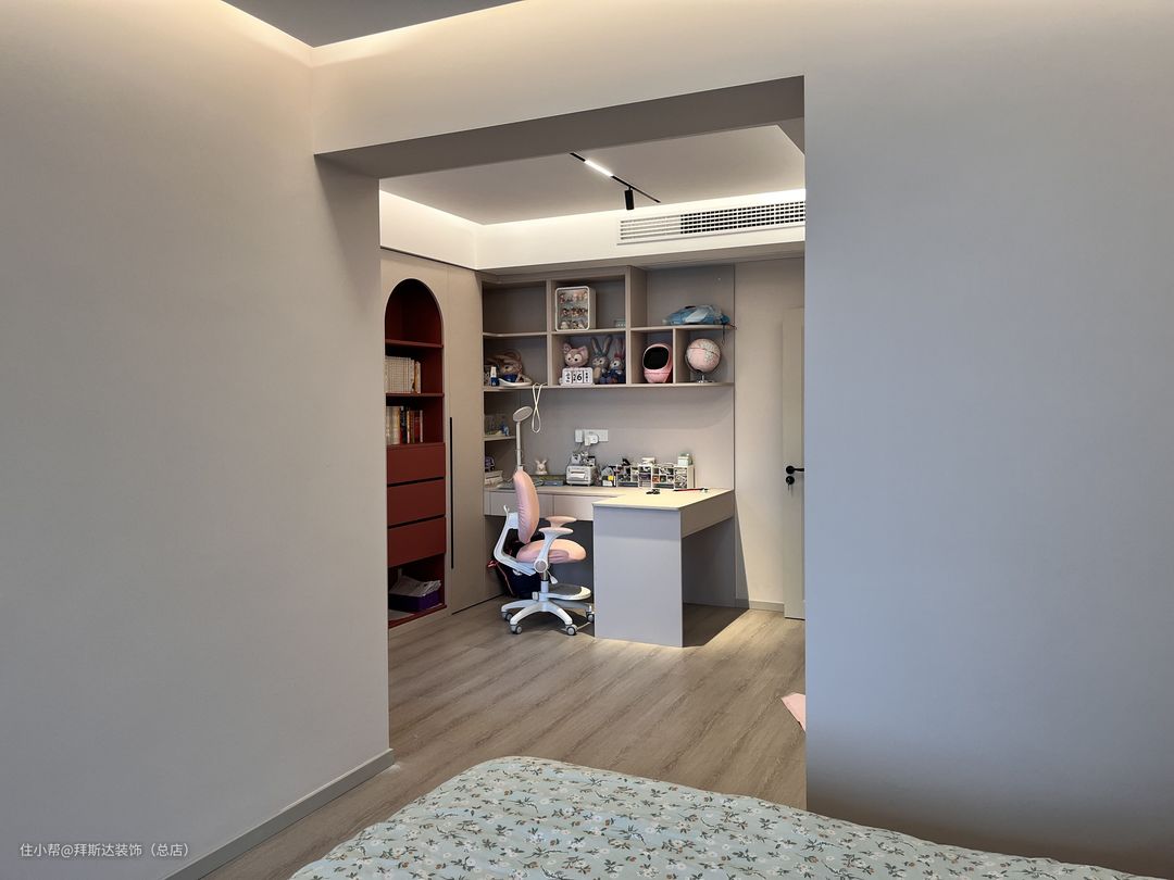 女儿房面积也非常大,将空间划分出了衣帽间、书房、休息区三个区域,生活阳台设计在女儿房的阳台,这样保留了客厅阳台的整体性。