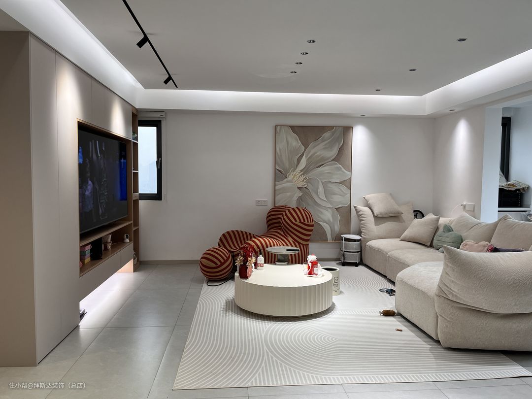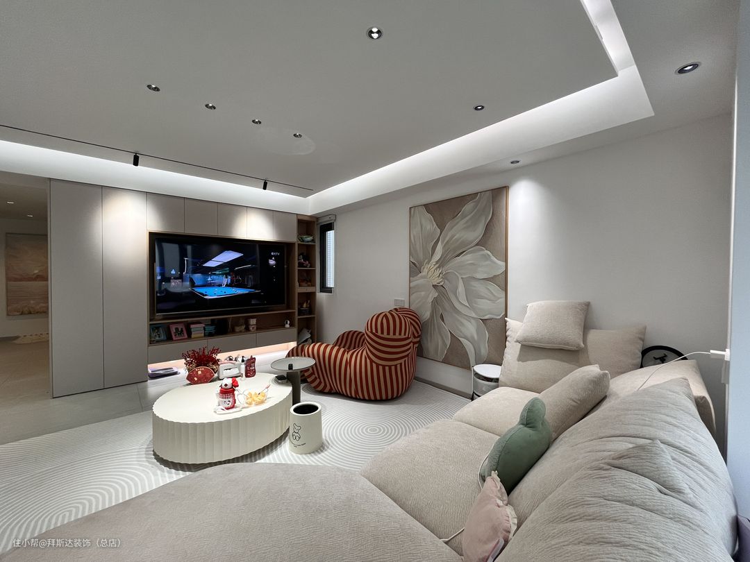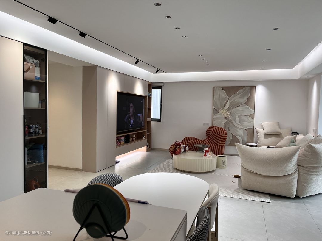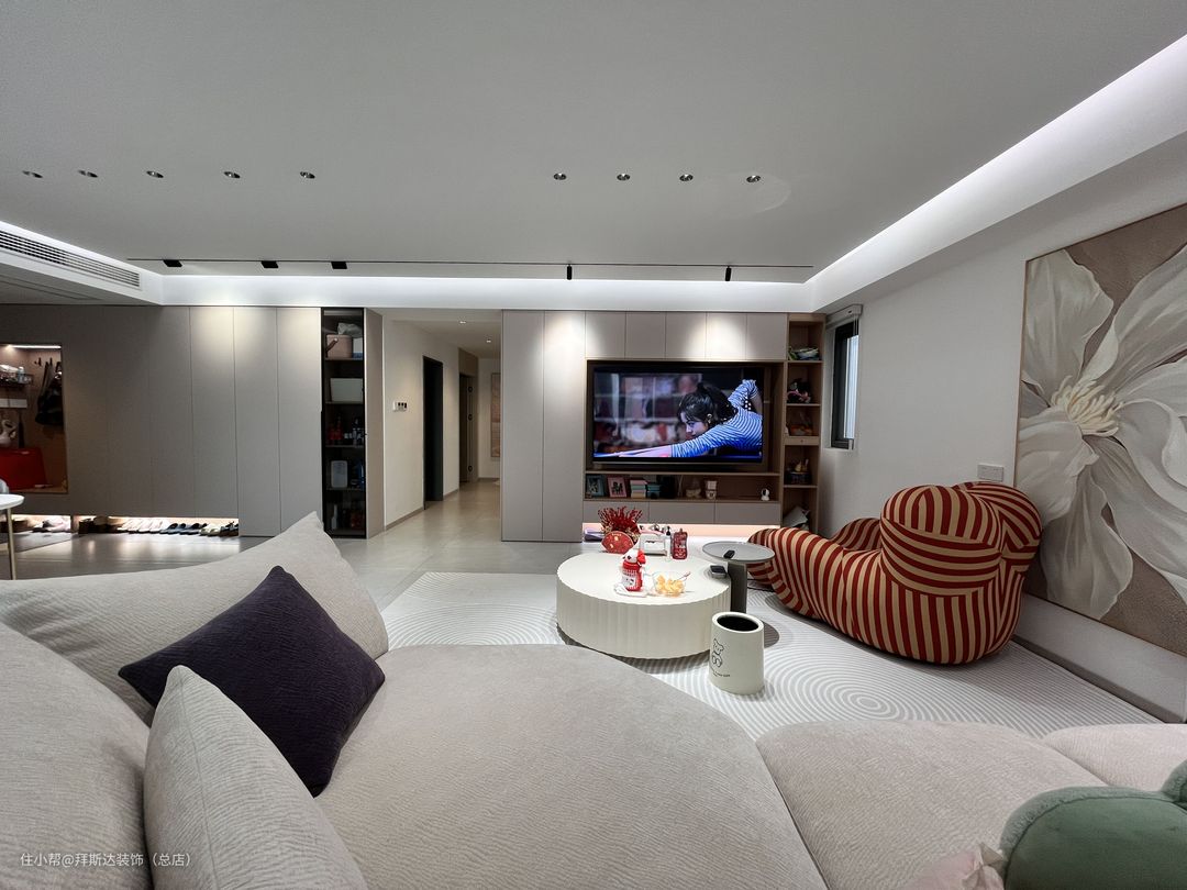 一进门视野就非常开阔,整体以白色和奶茶色为主色调,墙壁挂画也与主色调相统一,营造温柔治愈之感。玄关柜+储物柜+电视柜,使得墙面在同一水平面,整体感更强,全屋智能+无主灯设计+悬浮吊顶,使得整个空间光线都非常柔和。