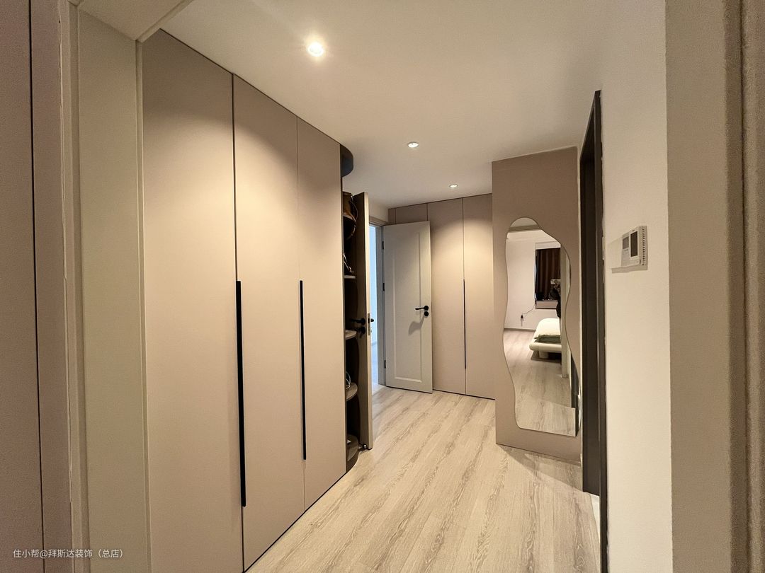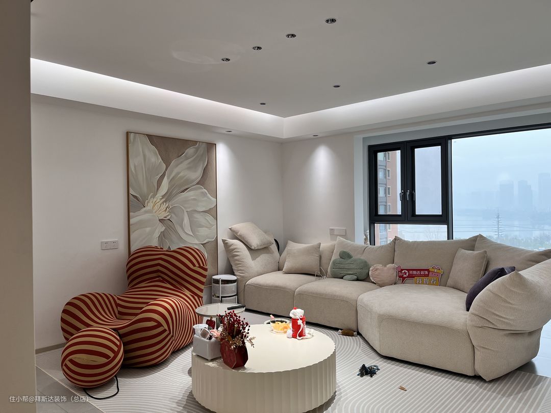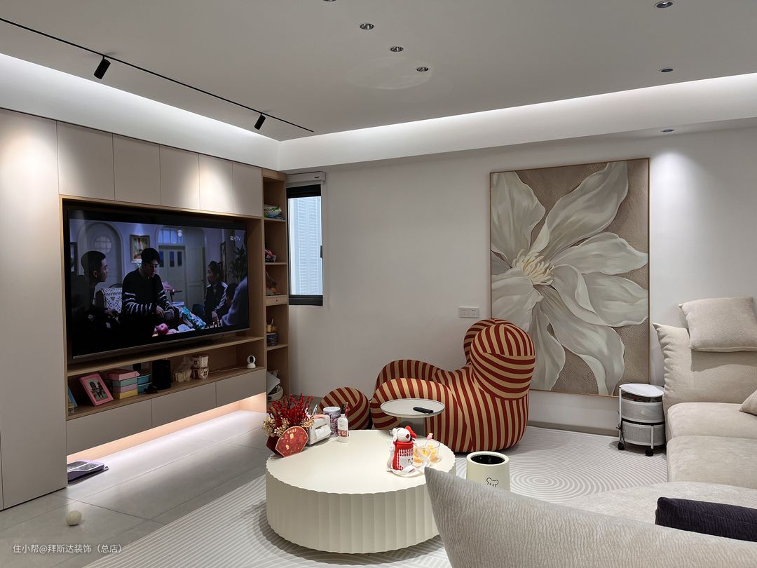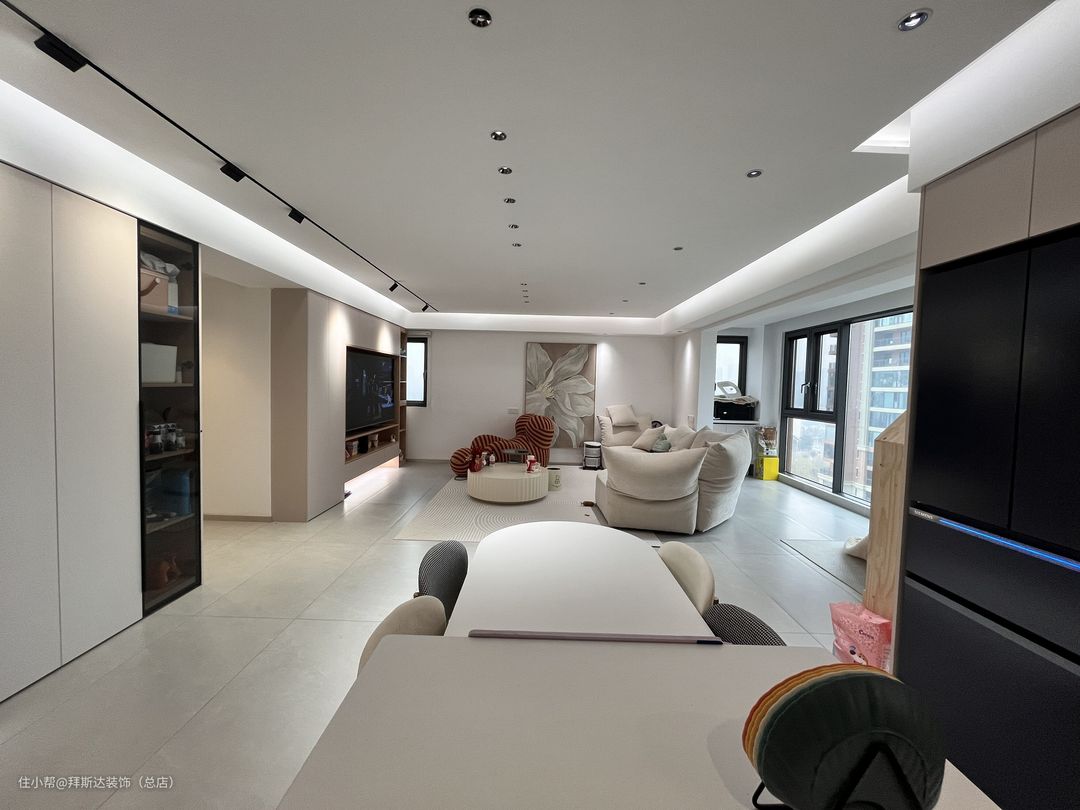 一进门视野就非常开阔,整体以白色和奶茶色为主色调,墙壁挂画也与主色调相统一,营造温柔治愈之感。玄关柜+储物柜+电视柜,使得墙面在同一水平面,整体感更强,全屋智能+无主灯设计+悬浮吊顶,使得整个空间光线都非常柔和。