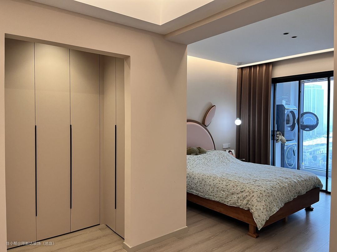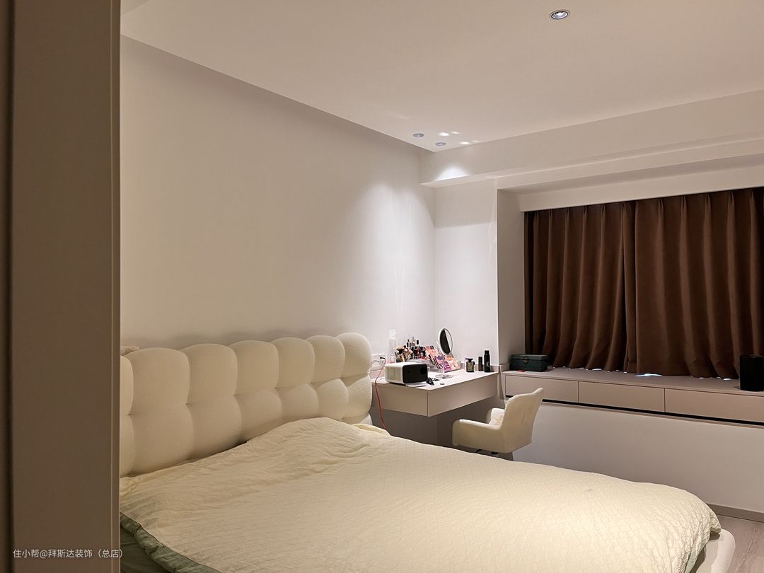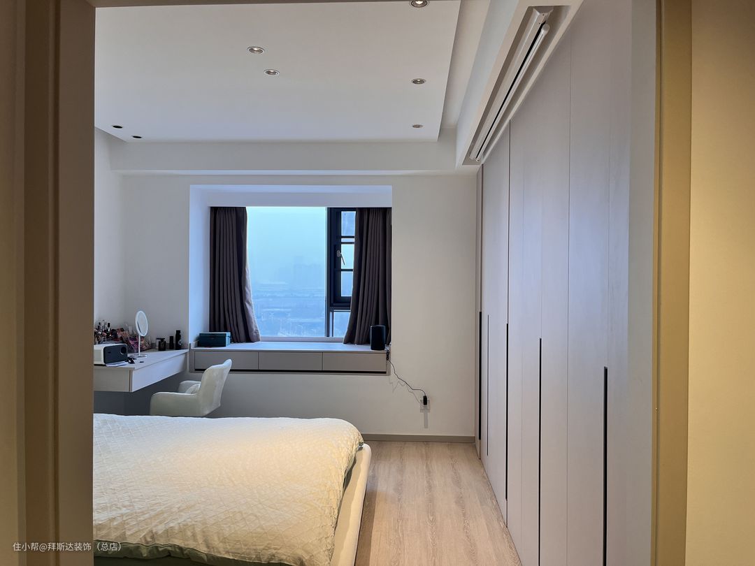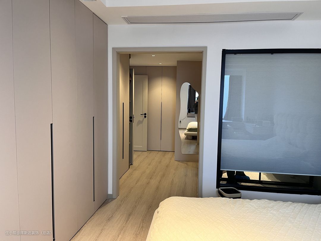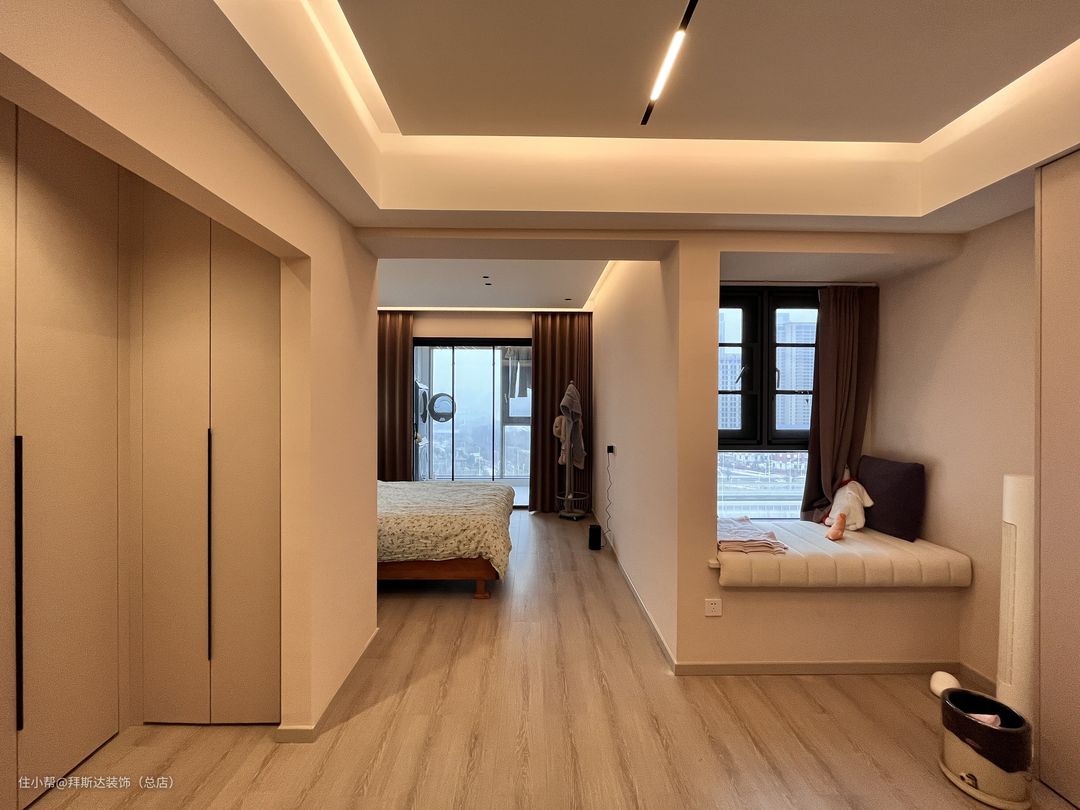 主卧空间非常大,房间门口便是衣帽间,门后、过道、床头都是衣柜,收纳空间非常充足,窗台上也设计了抽屉来放置小物件,卫生间浴缸区别于常见浴缸,由于宽度不够,所以设计了一个砖砌的浴缸,非常独特。
