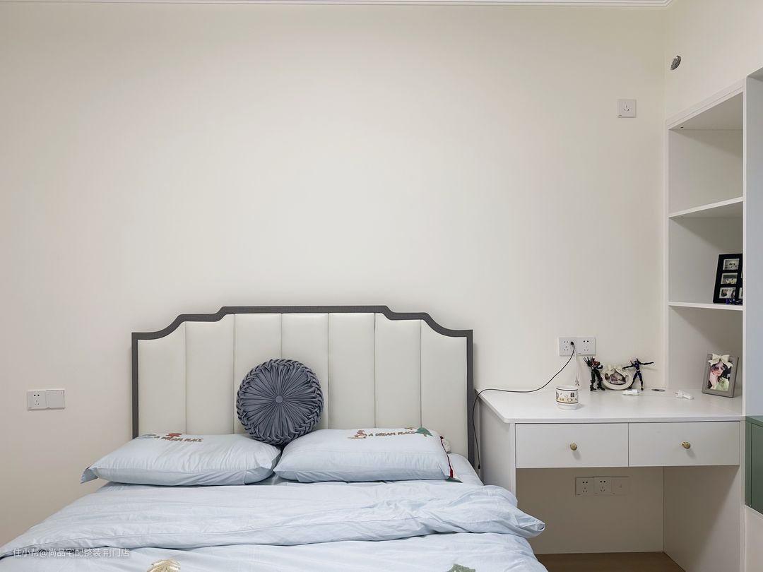 儿童房,业主强调收纳,整个飘窗被利用起来,延伸飘窗做了组1.2米的书桌,学习办公的同时也可以享受自然光线,600深的抽屉柜大大的增加了小朋友的一个收纳空间,整个配色贴合主题,增加了整个空间的整体性。