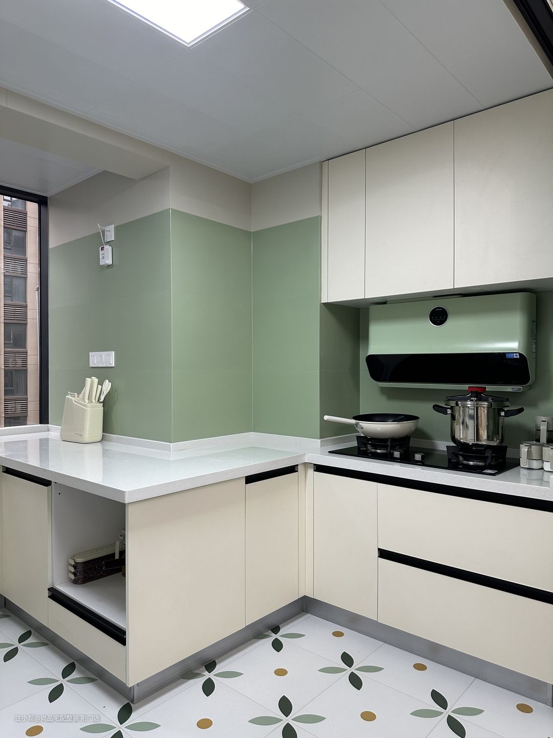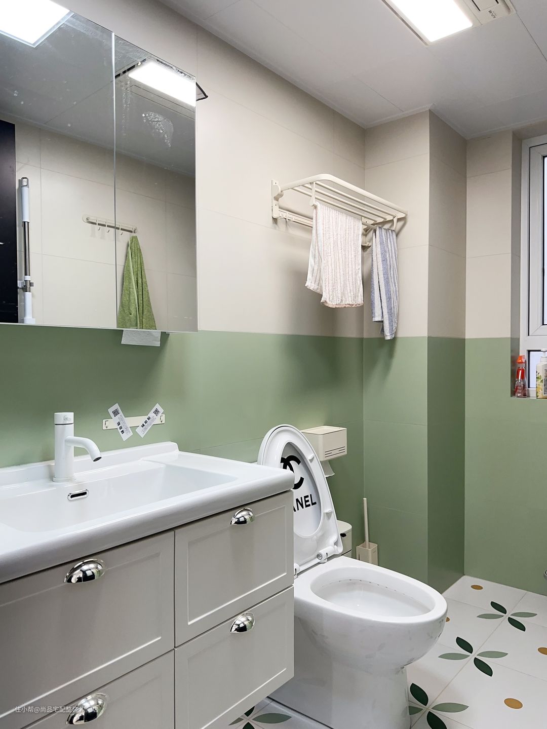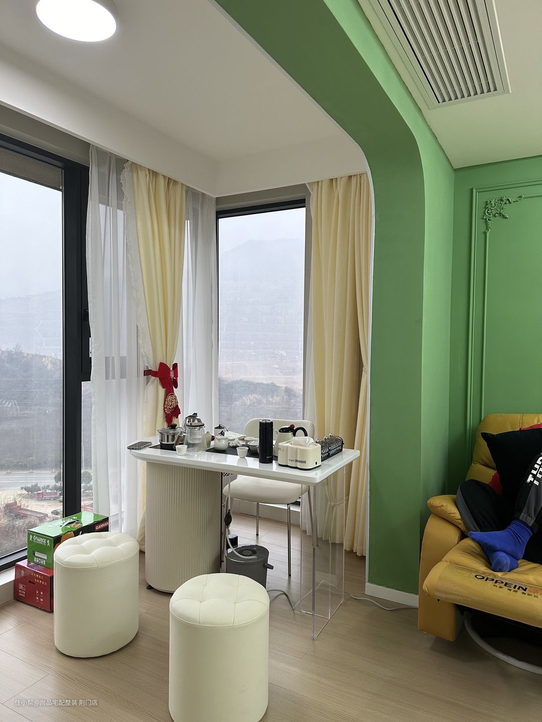 沙发背景墙采用了三组线条加角花的一个搭配,靠近阳台区域采用了螺旋藻绿的一个配色,呼应全屋的一个主题颜色,整个带线条的背景墙都是用的艺术漆涂料,后期打理卫也方便很多。