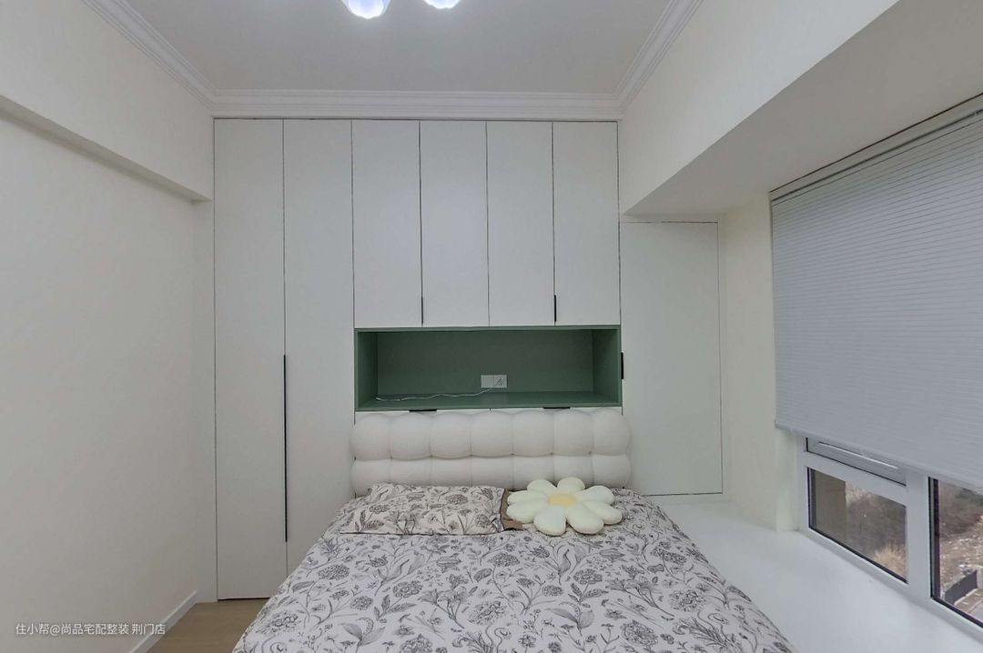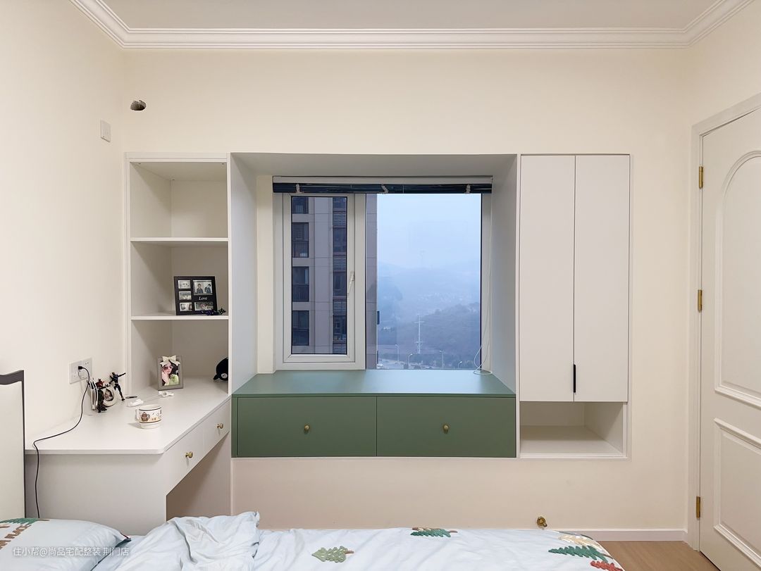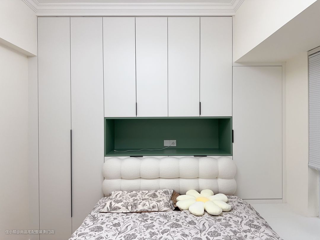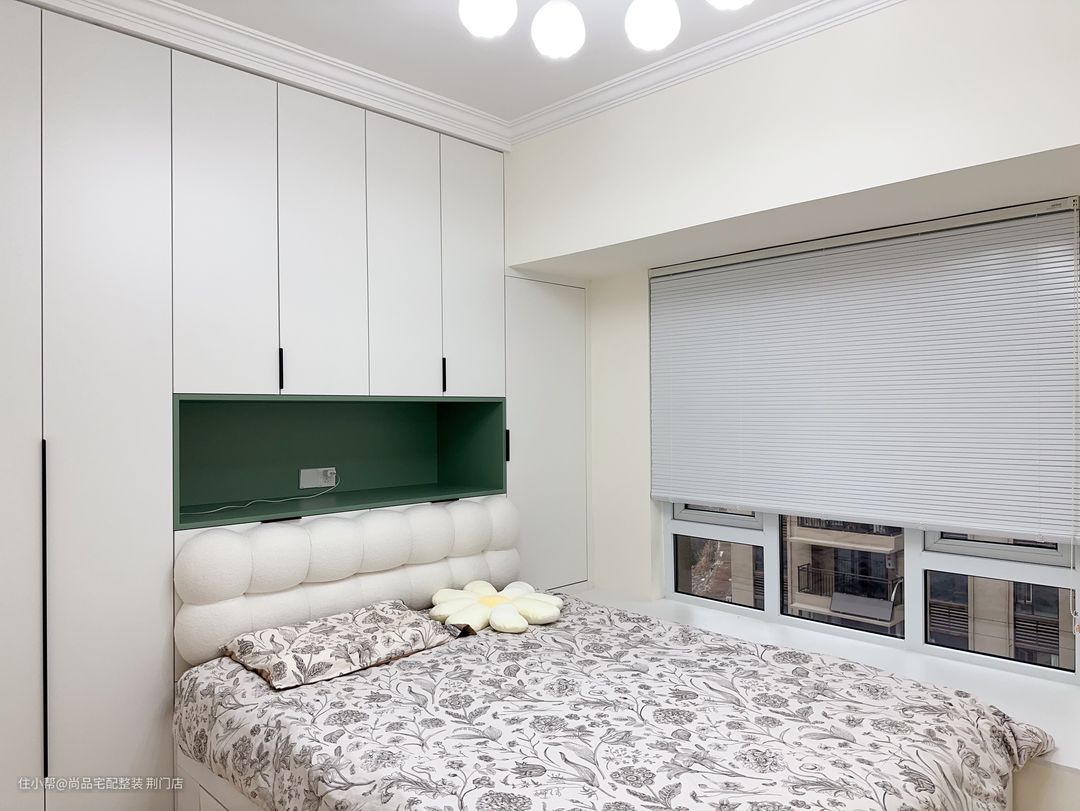 北边次卧室长辈居住,房间的面积却不足7㎡,且原有的飘窗不能拆除,则在空间利用上没有选择做传统的塌塌米,而是延伸飘窗做了排骨架+一整面墙的衣柜,绿色的套格作为一个床头柜的功能,在上面充电以及放置摆件或经常看的书籍、都有很好的装饰作用,这个房间面积虽小,但规划完了之后,让整个空间的功能性完全满足。
