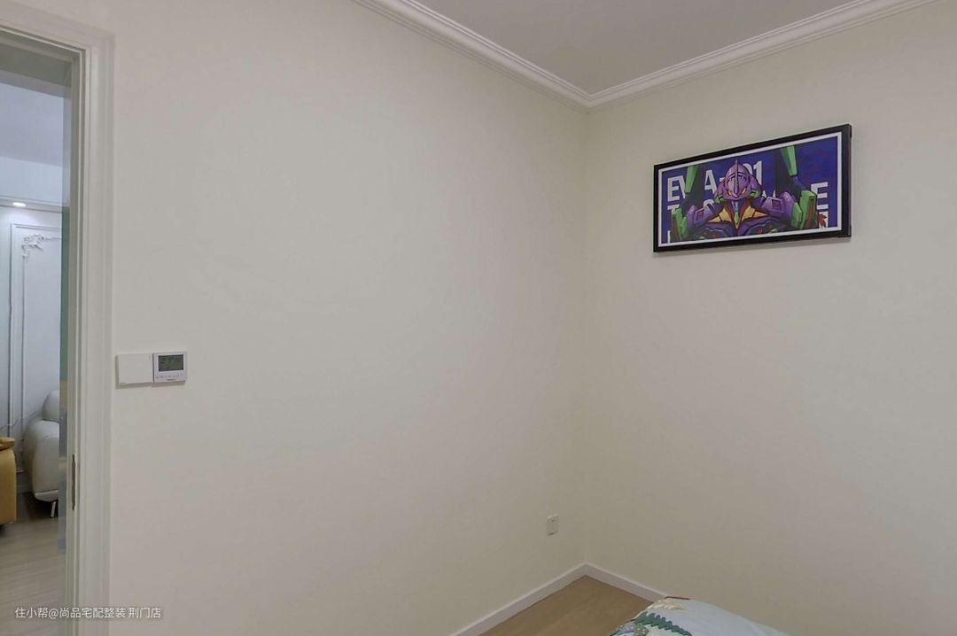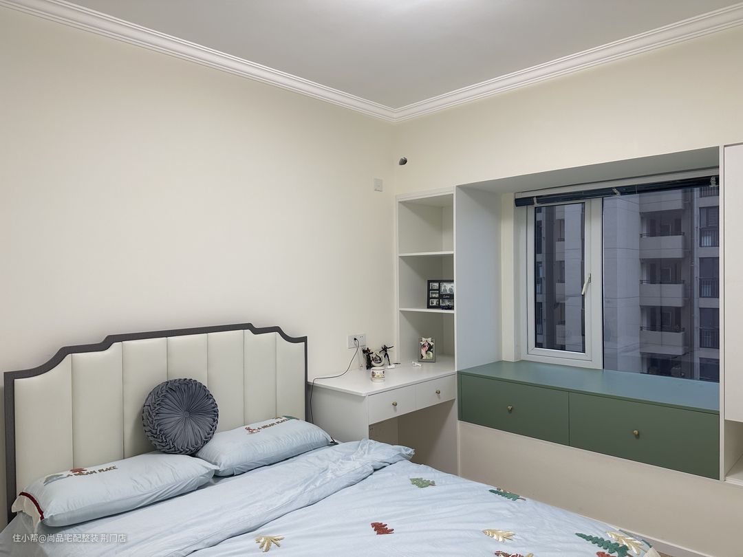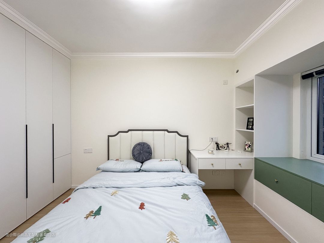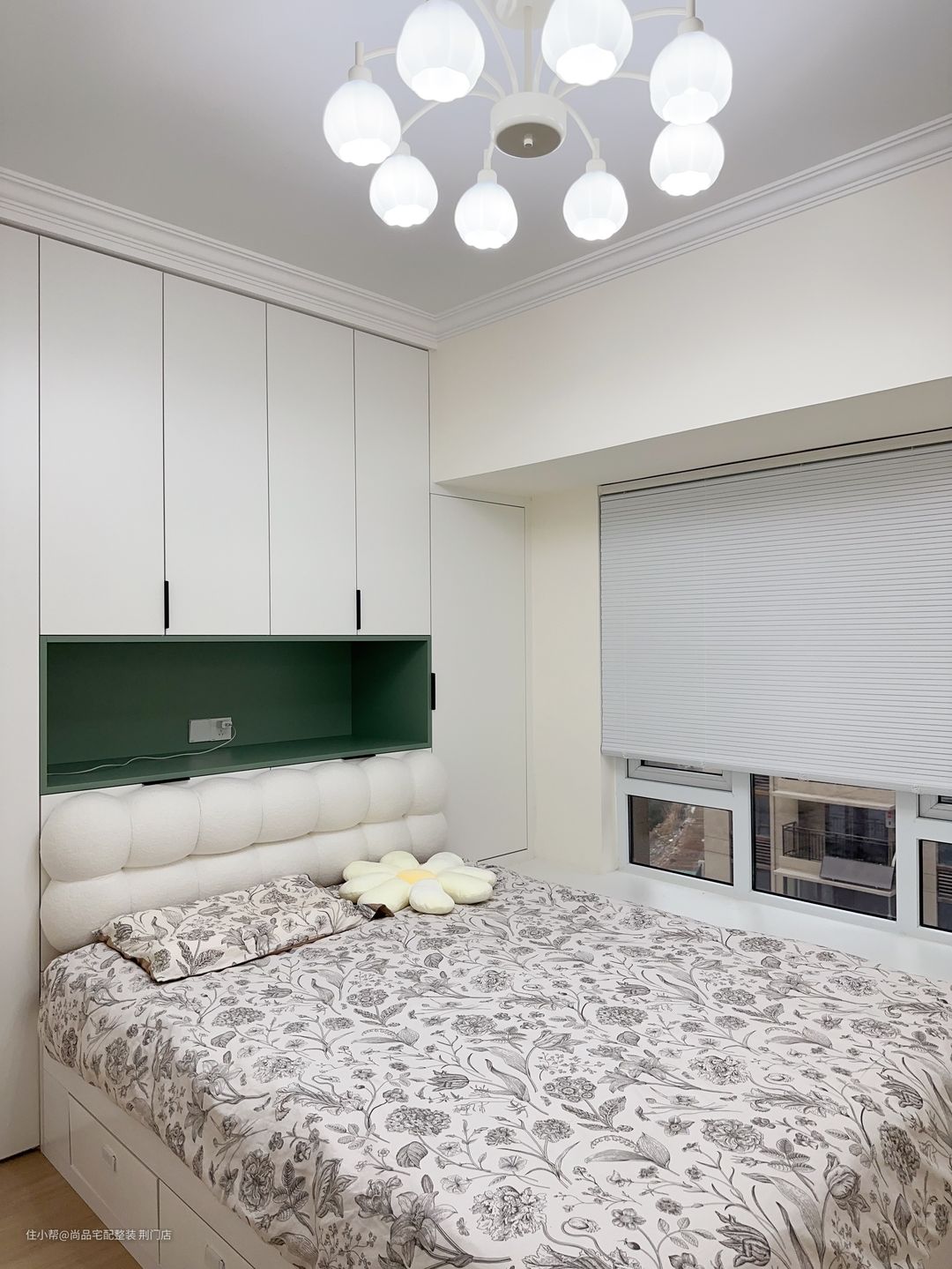 北边次卧室长辈居住,房间的面积却不足7㎡,且原有的飘窗不能拆除,则在空间利用上没有选择做传统的塌塌米,而是延伸飘窗做了排骨架+一整面墙的衣柜,绿色的套格作为一个床头柜的功能,在上面充电以及放置摆件或经常看的书籍、都有很好的装饰作用,这个房间面积虽小,但规划完了之后,让整个空间的功能性完全满足。