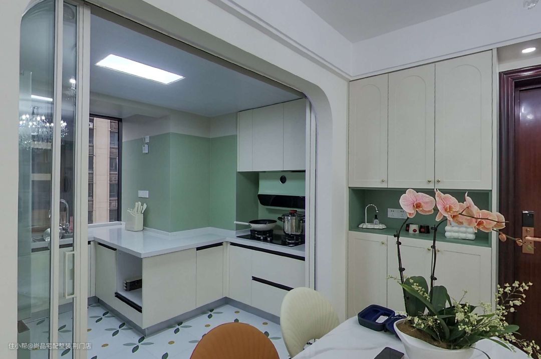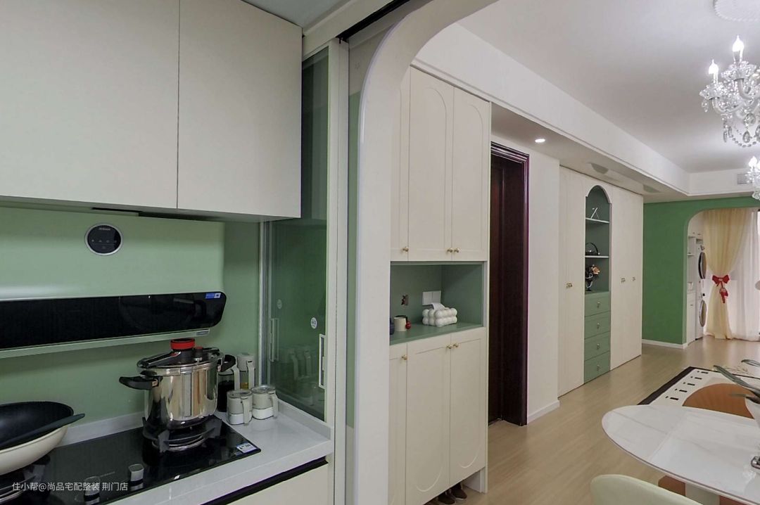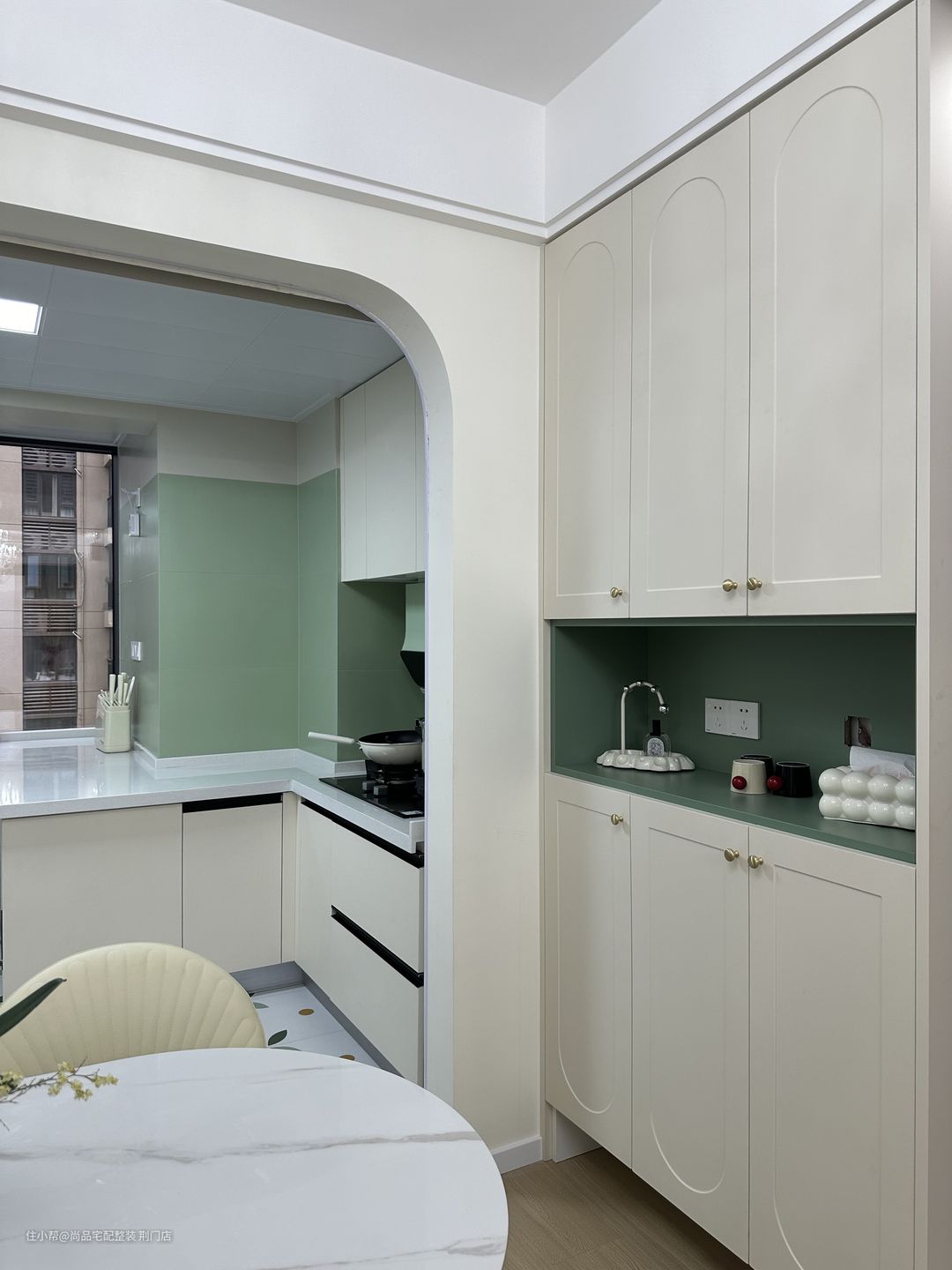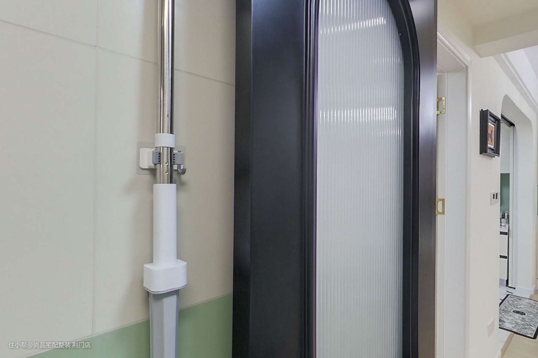 业主对厨房有较高的要求,为了扩大厨房的一个使用面积,将原始户型自带的阳台打通,使整个厨房实际使用面积增大至10平米。业主喜欢半开放厨房,我们则将厨房门设计为双联动吊轨门,平常不做饭的时候都将其隐藏在厨房墙垛后面,整个空间从视觉上看起来大了不止一点点。