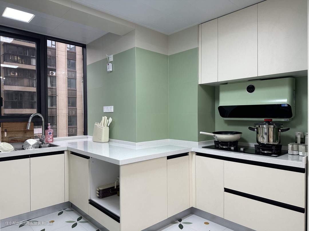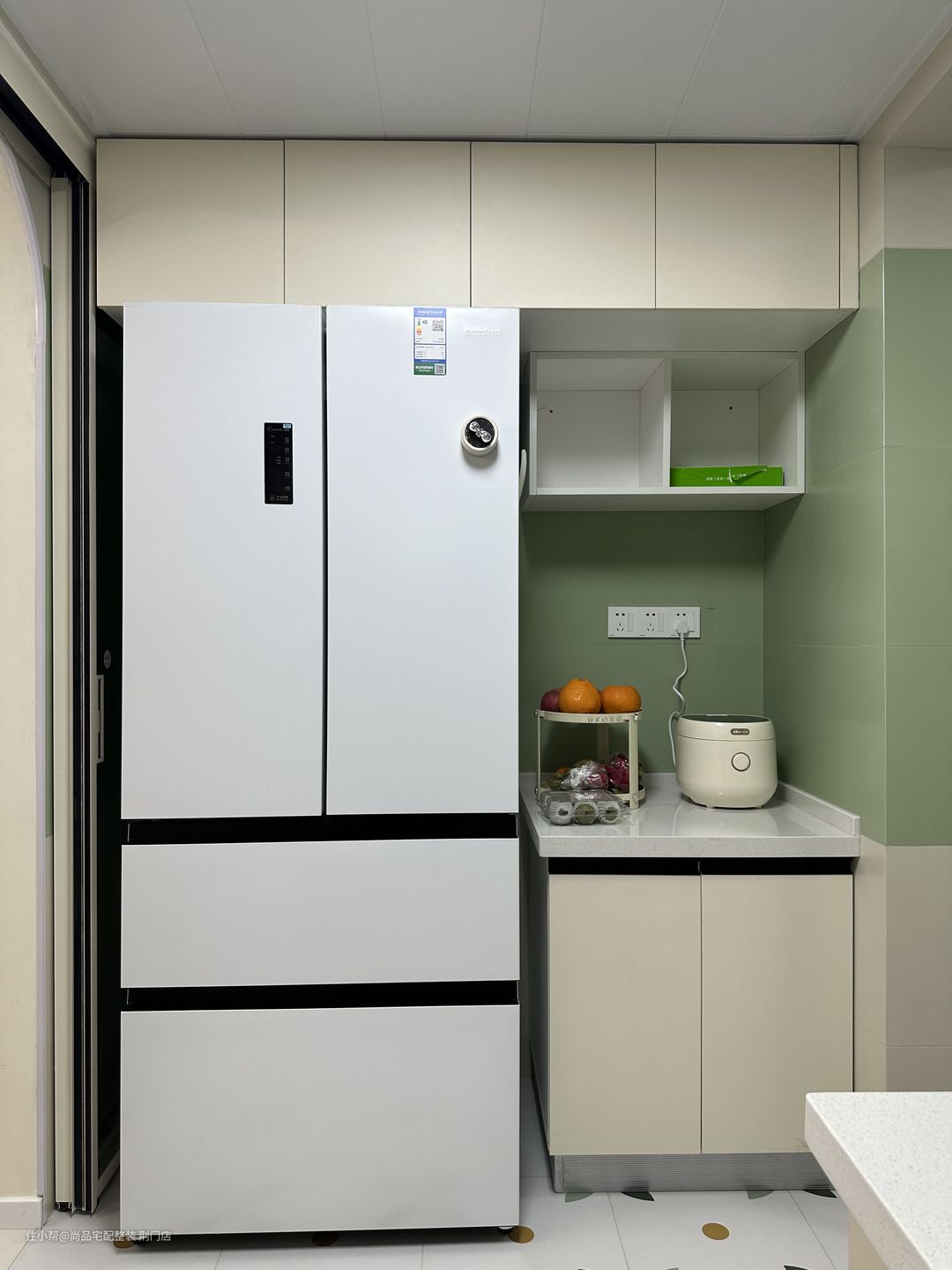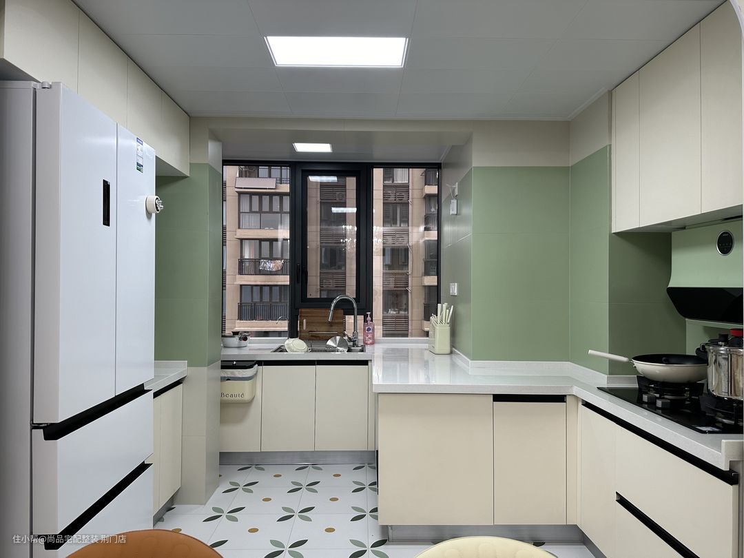 业主对厨房有较高的要求,为了扩大厨房的一个使用面积,将原始户型自带的阳台打通,使整个厨房实际使用面积增大至10平米。业主喜欢半开放厨房,我们则将厨房门设计为双联动吊轨门,平常不做饭的时候都将其隐藏在厨房墙垛后面,整个空间从视觉上看起来大了不止一点点。