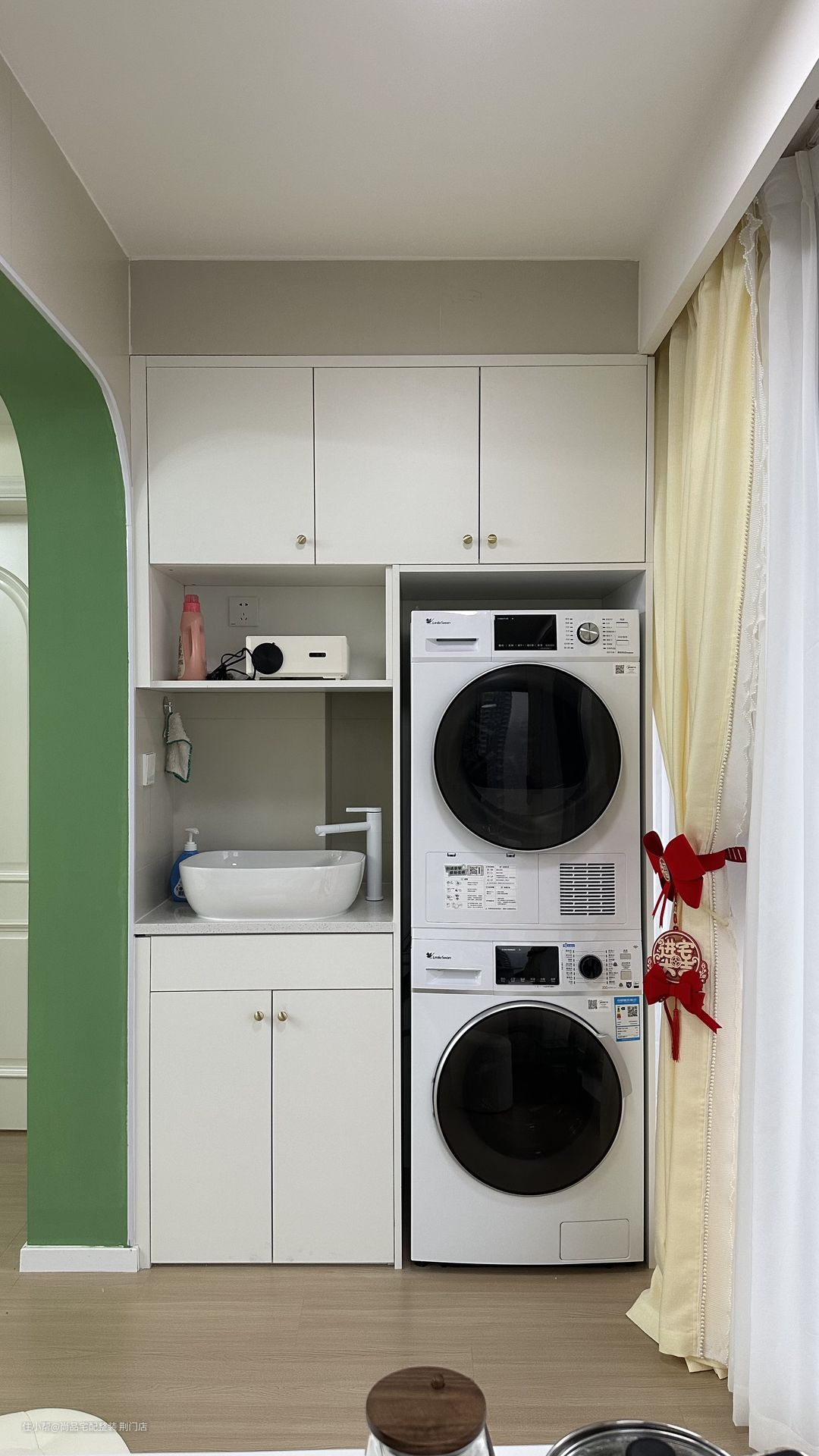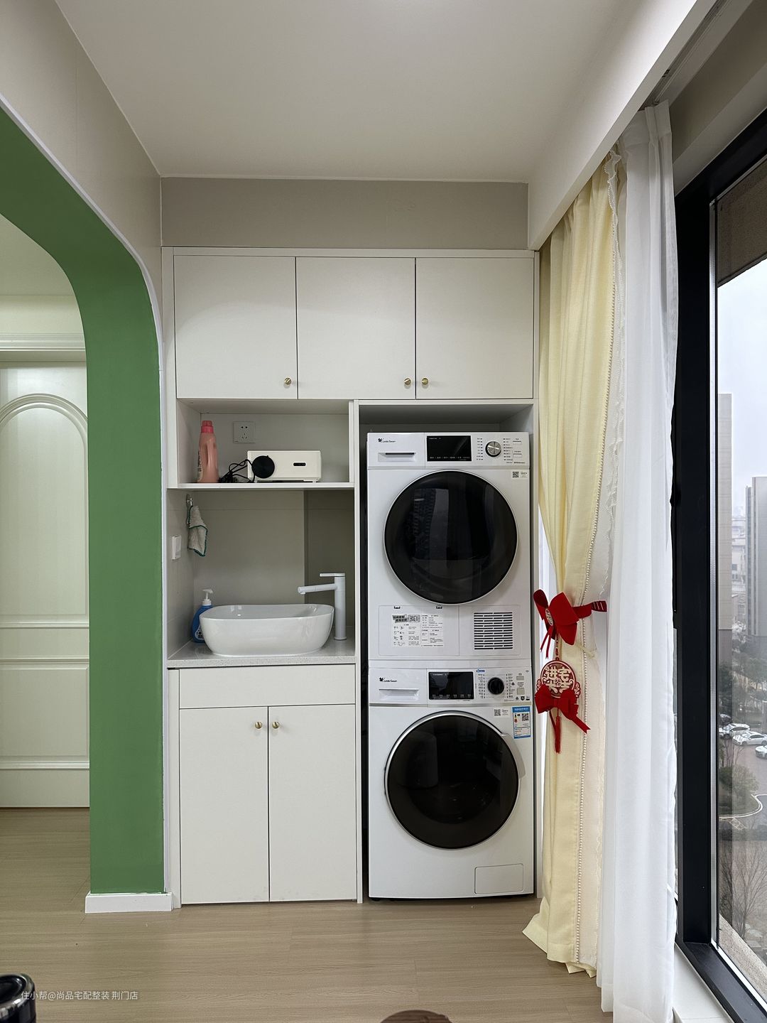 整个生活阳台区域,设置了洗衣机烘干机,利用包管后的小面积安排了一组台上盆,阳台的另一面应男主人要求,放置了一个小茶桌,房子里面的各个角落,都是一道好看的风景线。阳台窗帘选择透光不透影的薄纱窗帘,保持客厅内部的安静与私密性,让家更有安全感。