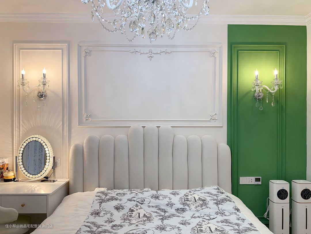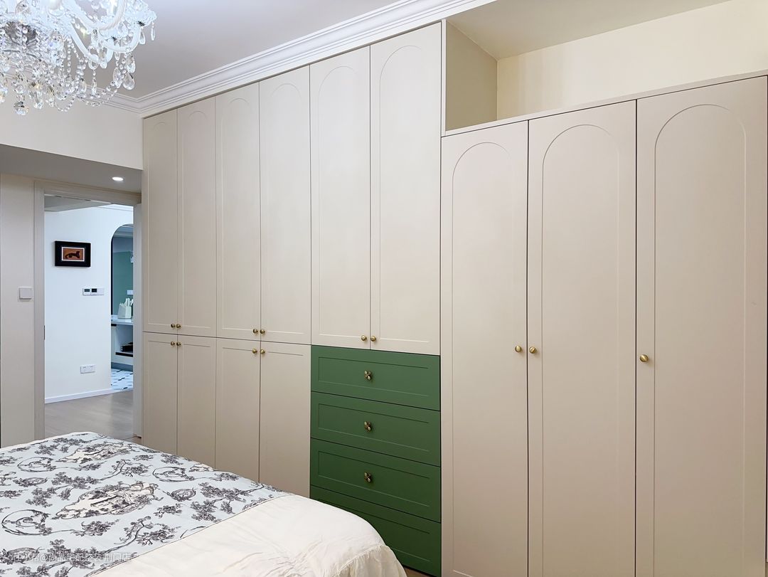 主卧背景墙,采用的法式线条加角花的一个设计,线条部位也是用的艺术涂料,具备防水耐氧化的功能,床头背景线条根据床的高度定制,完全无遮挡,在床的对立面做了满墙衣柜且预留了空调挂机的位置,整体柜门都采用了分体的模压门板,圆润的造型呼应了整个主题。