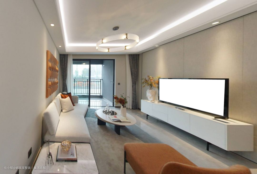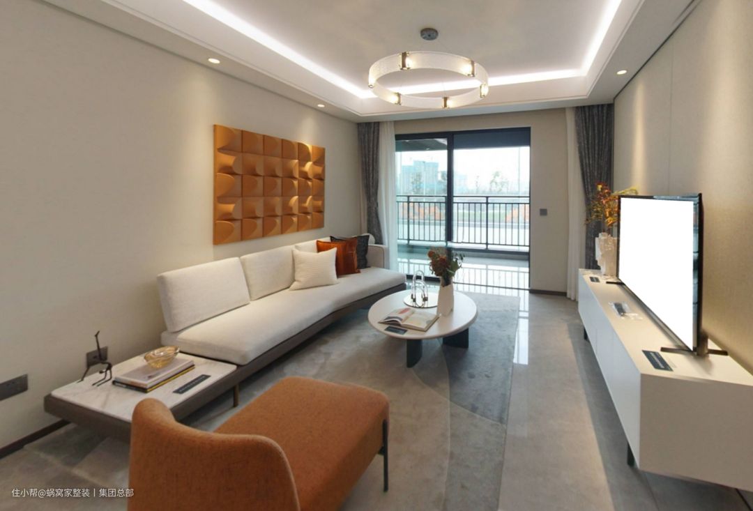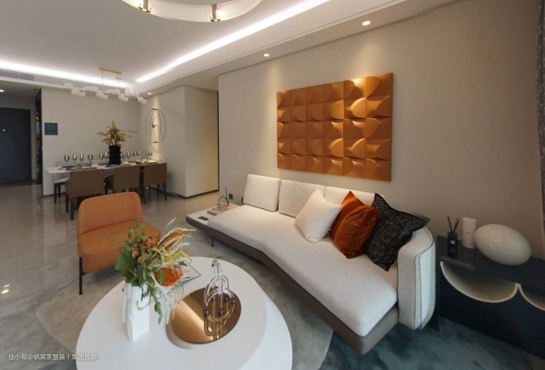 客厅整体色调以白色和橘色为主调。客厅中央放置着一条长条白色沙发,前面是一个圆形白色茶几。在沙发的一侧摆放着一个橘色的单人沙发,为整体空间增添了亮丽的色彩。沙发后面的墙壁上挂着一个橘色装饰物,与单人沙发相呼应,营造出和谐的氛围。在客厅顶部悬挂着一个圆形吊灯,为整个空间增添了现代感。此外,还有一些双眼皮吊灯点缀在客厅的角落,为空间增添了一丝温馨和浪漫的氛围。整个客厅设计简约大方,色彩搭配和谐,给人一种舒适宜人的感觉。