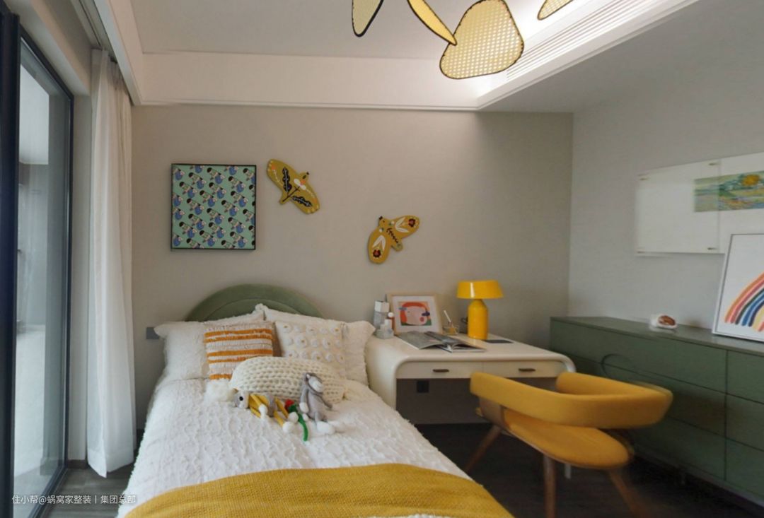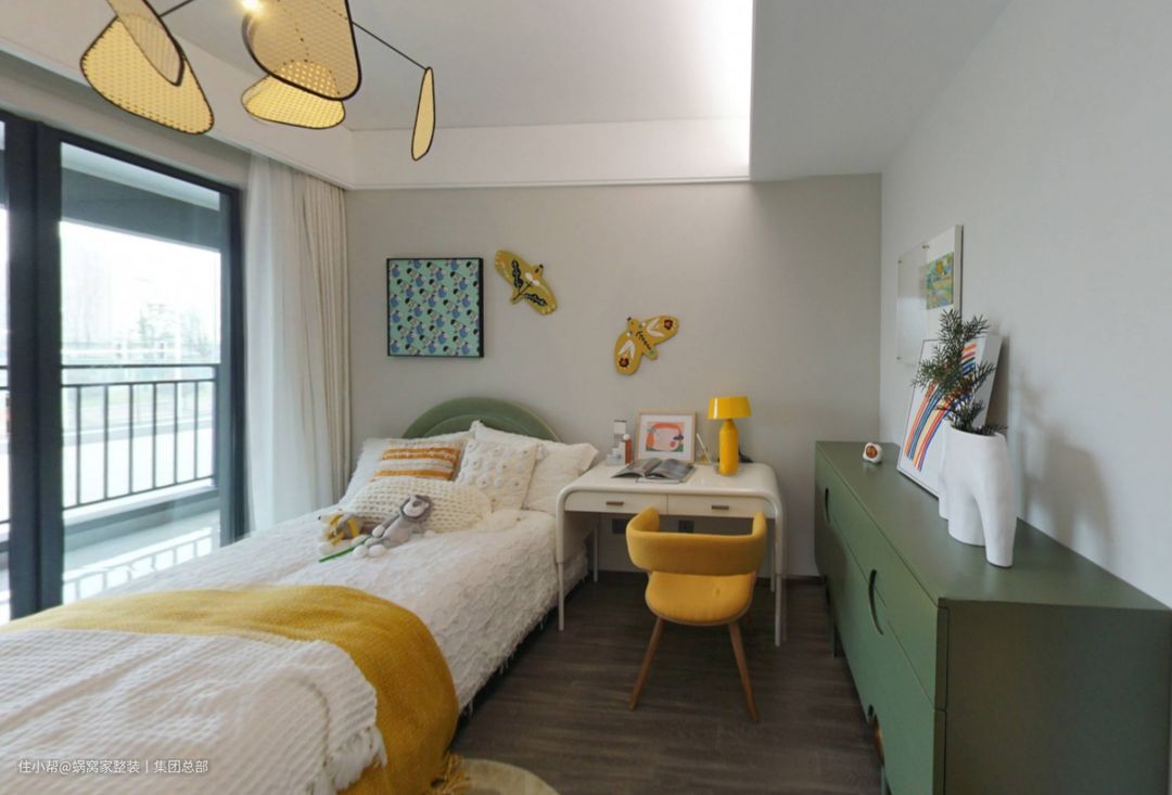 这个简约儿童房设计以黄色和绿色为主色调,展现出清新明亮的氛围。房间靠近大落地窗的一侧摆放着一张黄色床品的单人床,床头位置悬挂着一个扇叶型吊灯,为房间增添了一丝温馨的氛围。床的旁边是一个简约的白色书桌,搭配着一个黄色椅子,为孩子提供了一个舒适的学习和休息空间。书桌上摆放着一些文具和书籍,让孩子可以方便地进行学习和阅读。