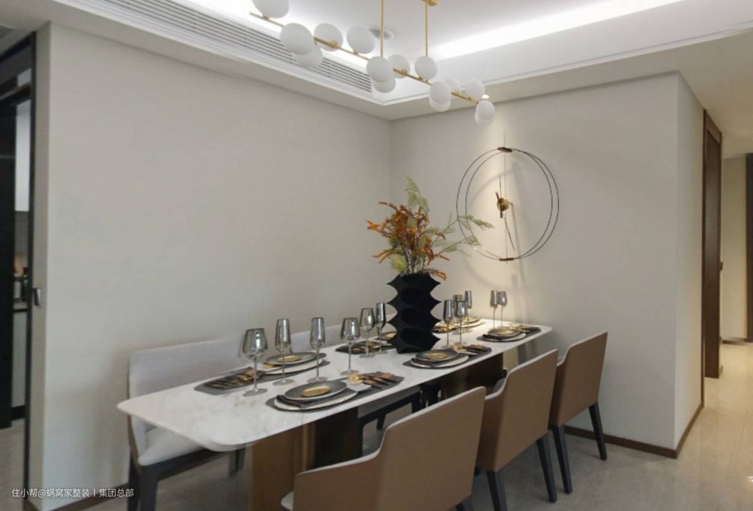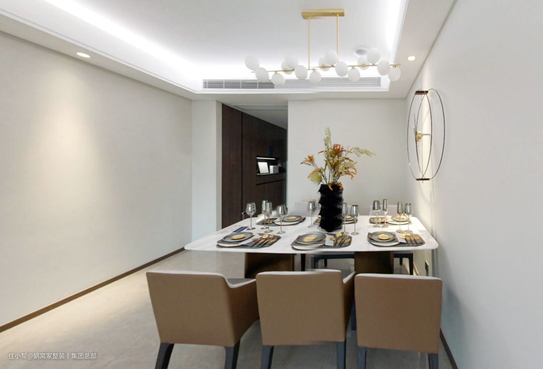 餐厅中,一张白色的餐桌靠着墙放置着。餐桌上摆放着一盆干花,为整个空间增添了一丝自然的元素。同时,餐桌上方悬挂着一个设计感强烈的吊灯,照亮了整个餐桌区域,营造出温馨而舒适的用餐氛围。整个空间简洁干净,通过色彩和灯光的搭配,展现出现代时尚的餐厅设计风格。