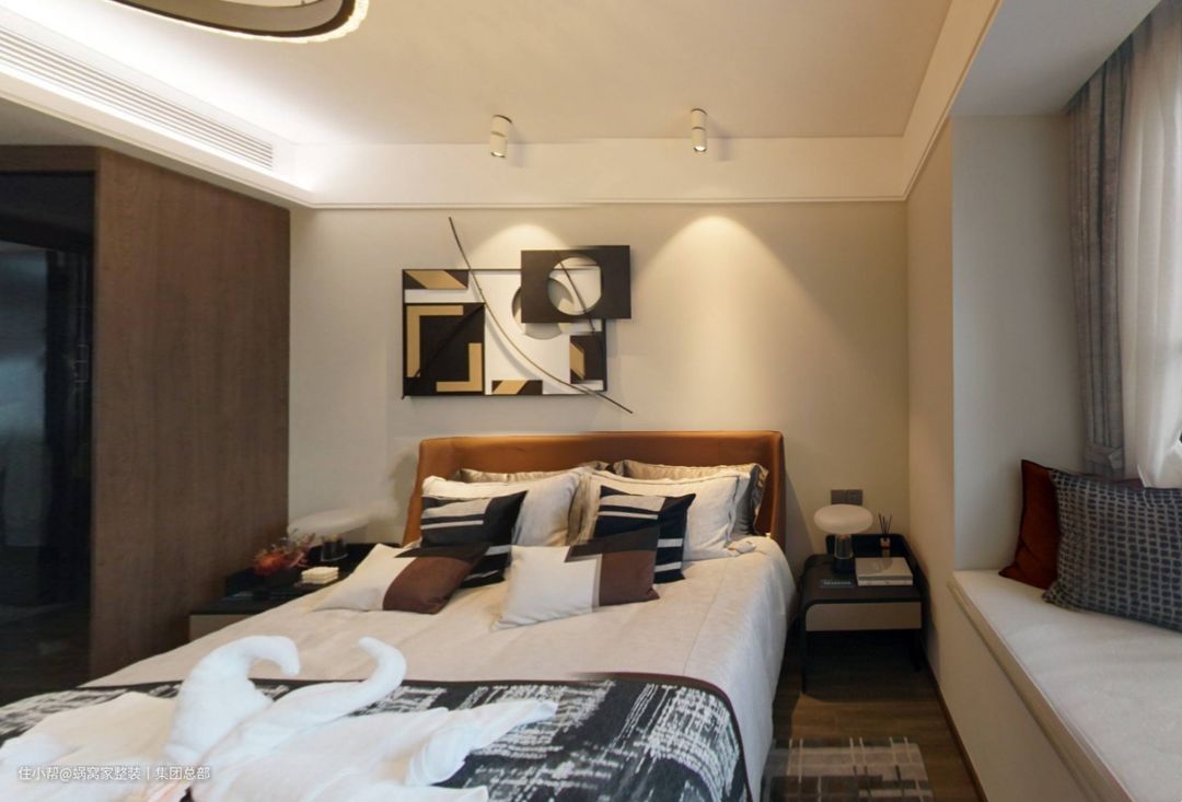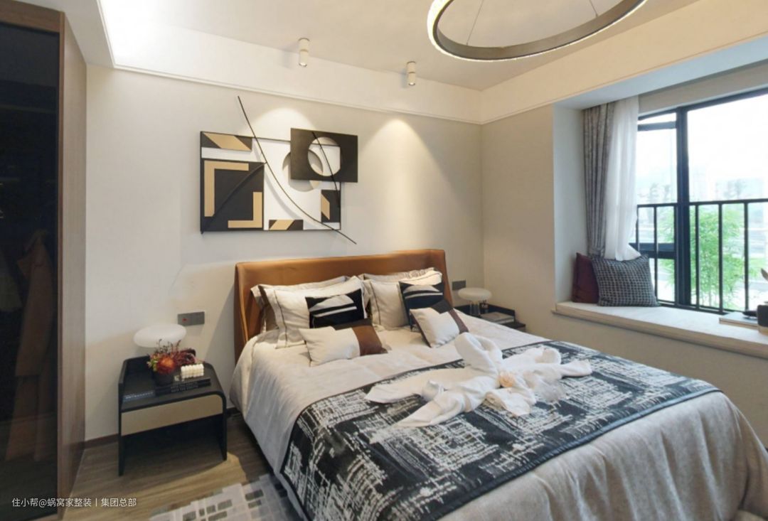 这间简约风格的主卧室拥有一张宽敞的大双人床,床头的墙壁上挂着一个抽象装饰画,为房间增添了艺术氛围。床旁的大飘窗台采用白色色调,搭配简约的窗帘,让充足的自然光线洒入房间。床上方悬挂着一个优雅的圆形吊灯,为房间增添了一丝现代感。整个空间以简约清爽的设计风格为主,营造出舒适宁静的氛围。