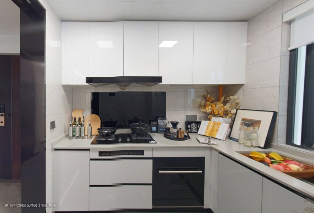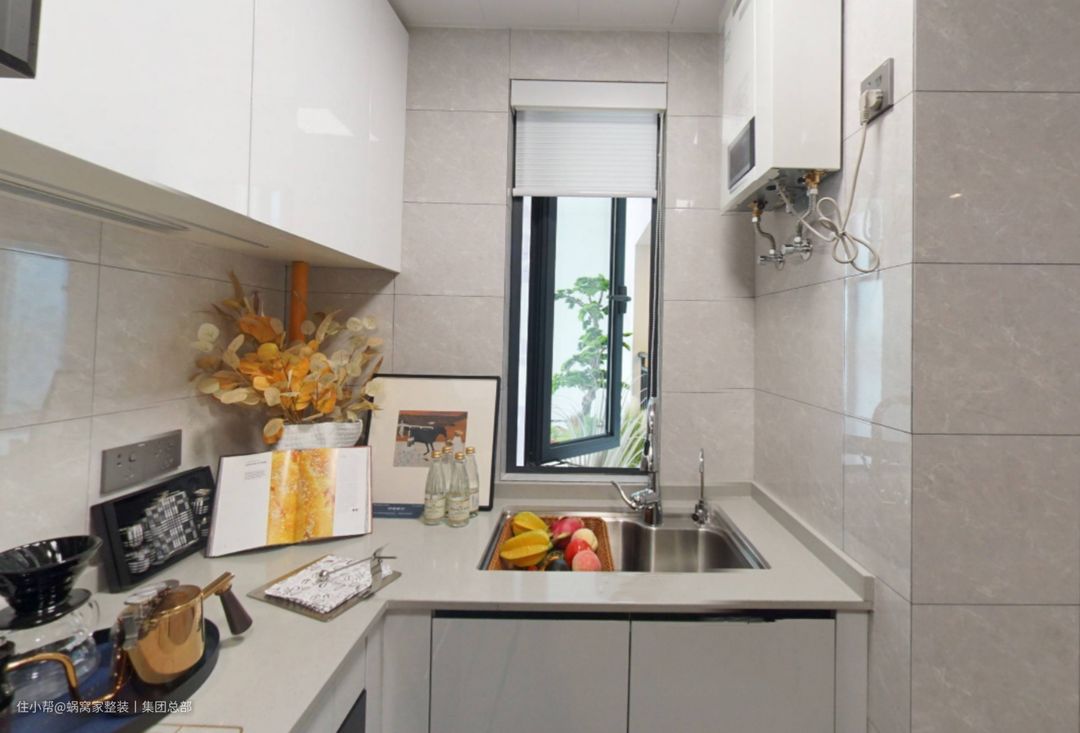 呈长廊型的厨房,采用L型的布局方式,为业主打造出一个“流水线”式的操作台,让厨房的烹饪动线更加流畅,让业主在烹饪时效率更高。将洗菜区布局在窗口前,一来让业主在白天洗菜时能看得更清楚,二来,大采光的窗户,不仅为厨房带来了充足的光线,还让厨房的空气流通性更强,让厨房时刻保持新鲜的空气。桌面上搭配一幅装饰画,给厨房带来别样的氛围。