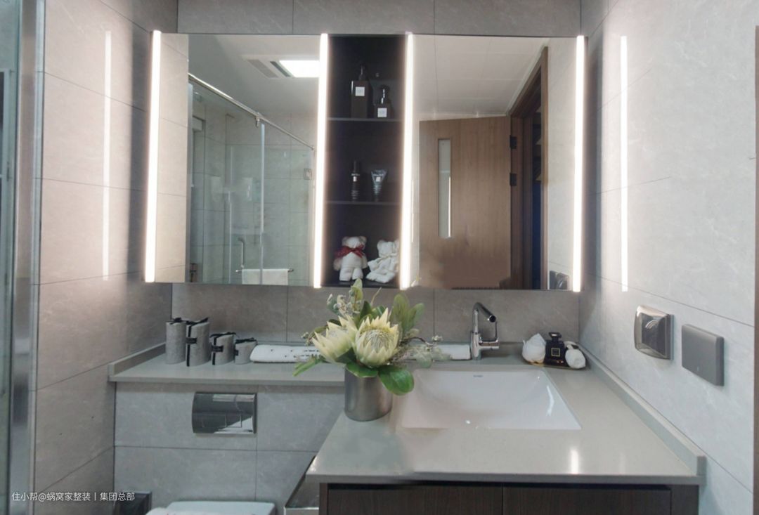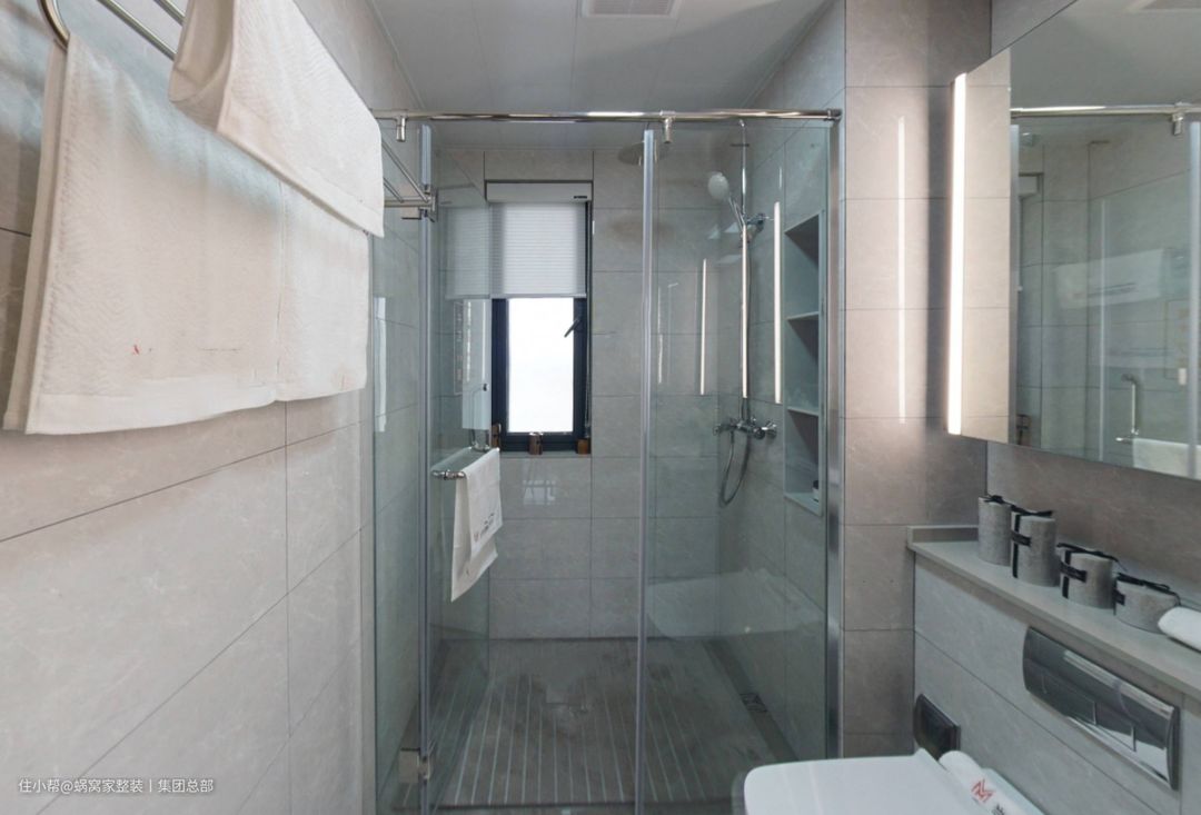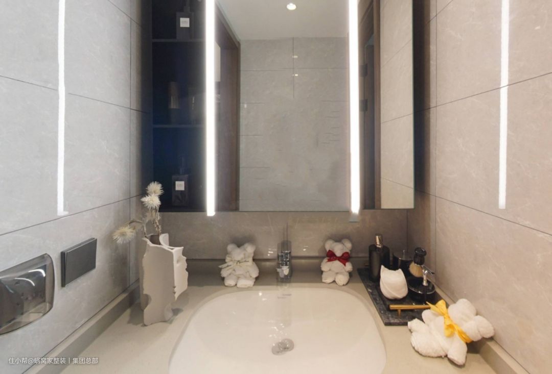 往里走是一个次卫,将镜柜置入卫生间,扩展了卫生间的收纳空间,同时,还更方便业主的日常使用需求;搭配L型的洗漱台,更方便了业主常用物品的收纳。防爆玻璃打造的干湿分离,为业主保留了一个单独的淋浴区,提高了业主的日常使用舒适度。