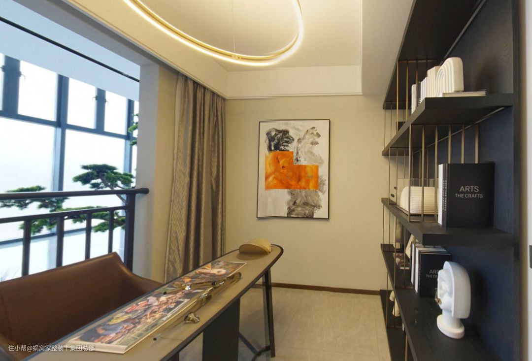 书房中央是一个椭圆形的褐色书桌,上面摆放着一本打开的书和一个装订整齐的文件夹。书桌前是一个开放式的黑色置物架,上面摆放着各种书籍和装饰物。墙壁上挂着一个抽象的装饰画,画面色彩艳丽,给整个空间增添了一抹艺术气息。书桌上方悬挂着一个暖色调的圆形吊灯,柔和的灯光洒在书桌上,营造出温馨舒适的阅读氛围。整个书桌设计简约大方,让人感到舒适和放松。