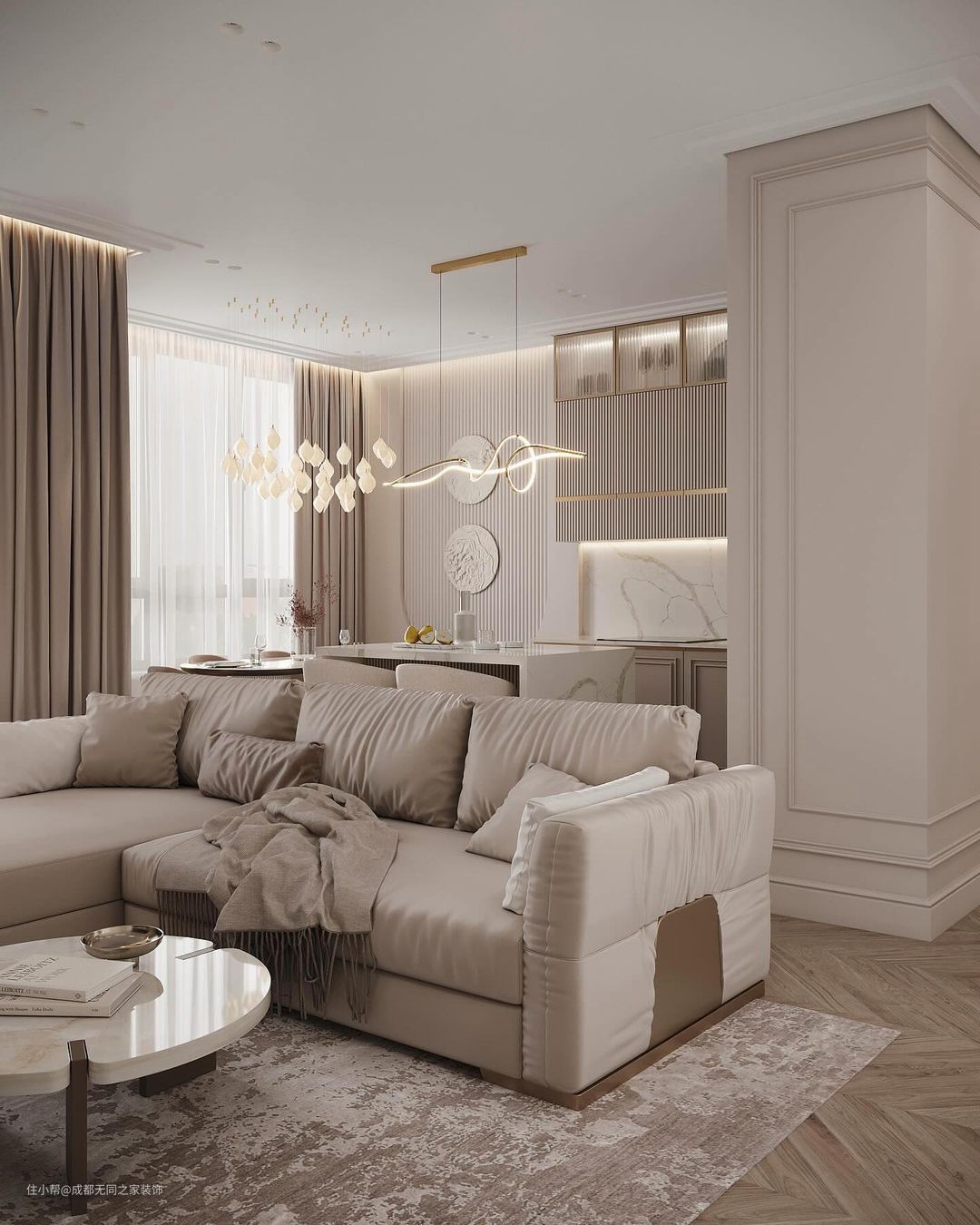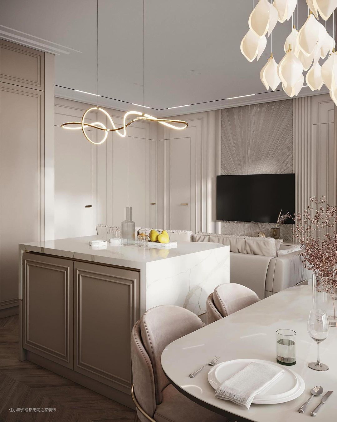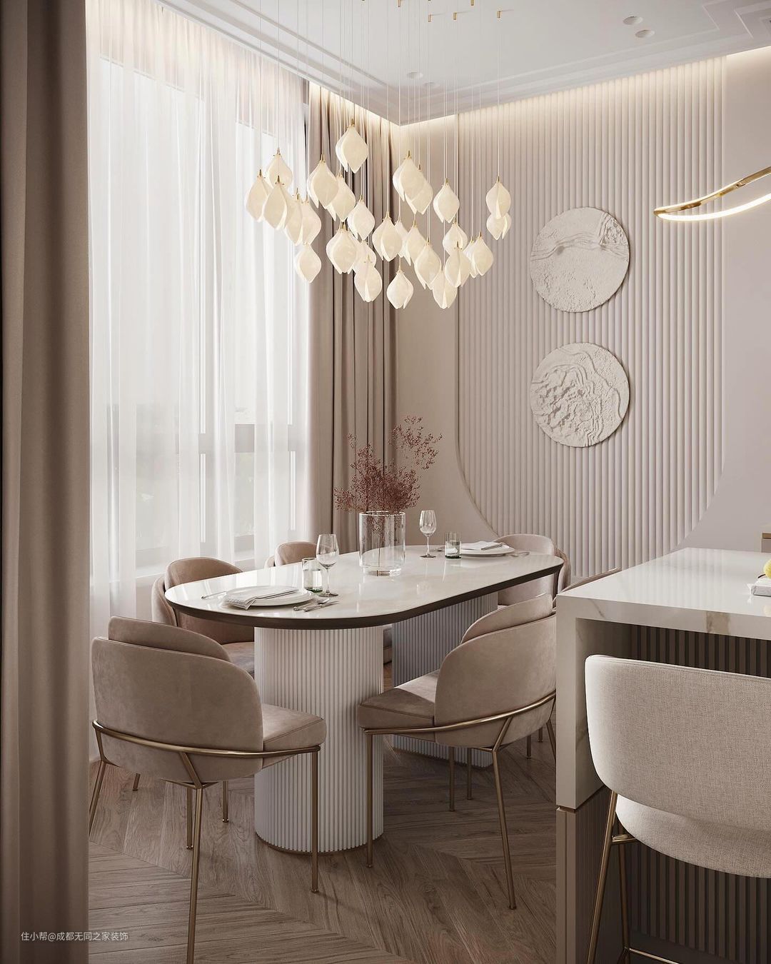 在细节上,使用竖条纹元素,凸显线条的干净利落简约美;金属质感的装饰灯、造型不一的吊灯和各种小点缀表现现代轻奢感。