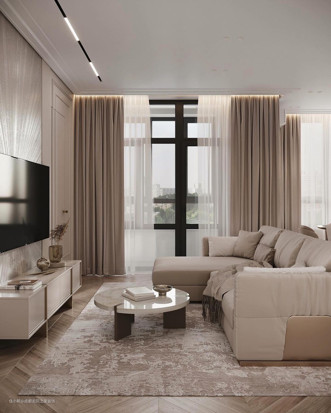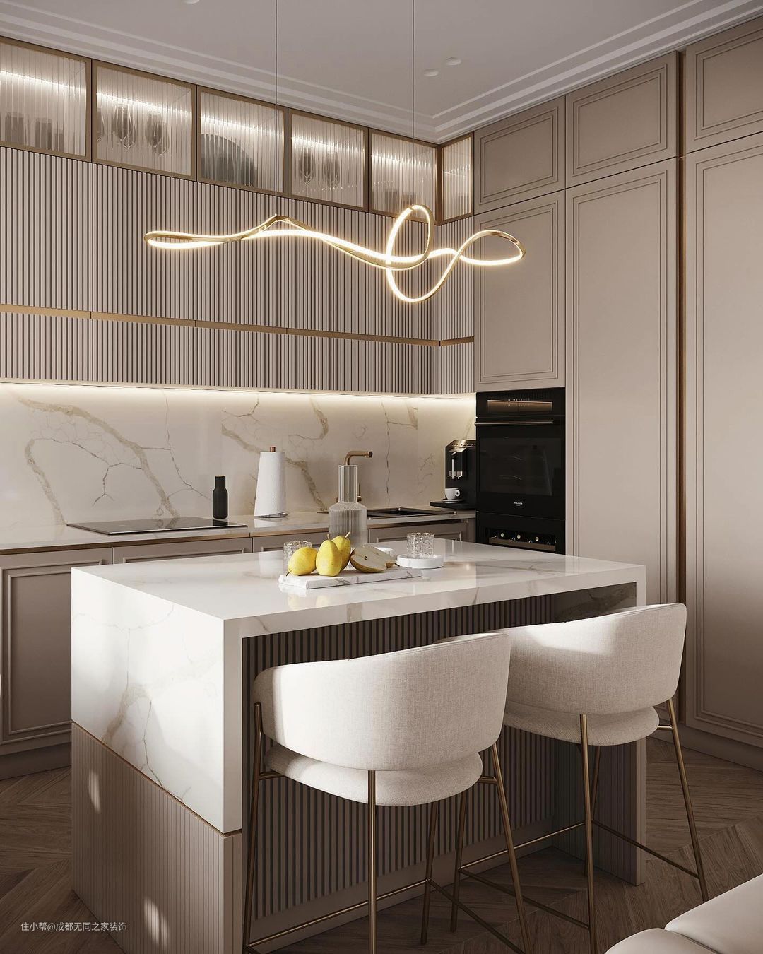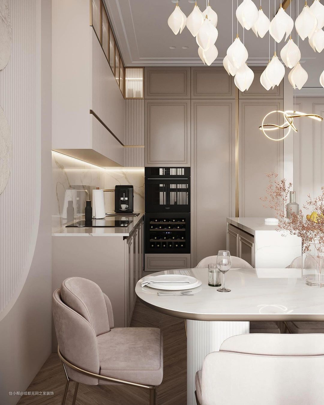 在细节上,使用竖条纹元素,凸显线条的干净利落简约美;金属质感的装饰灯、造型不一的吊灯和各种小点缀表现现代轻奢感。