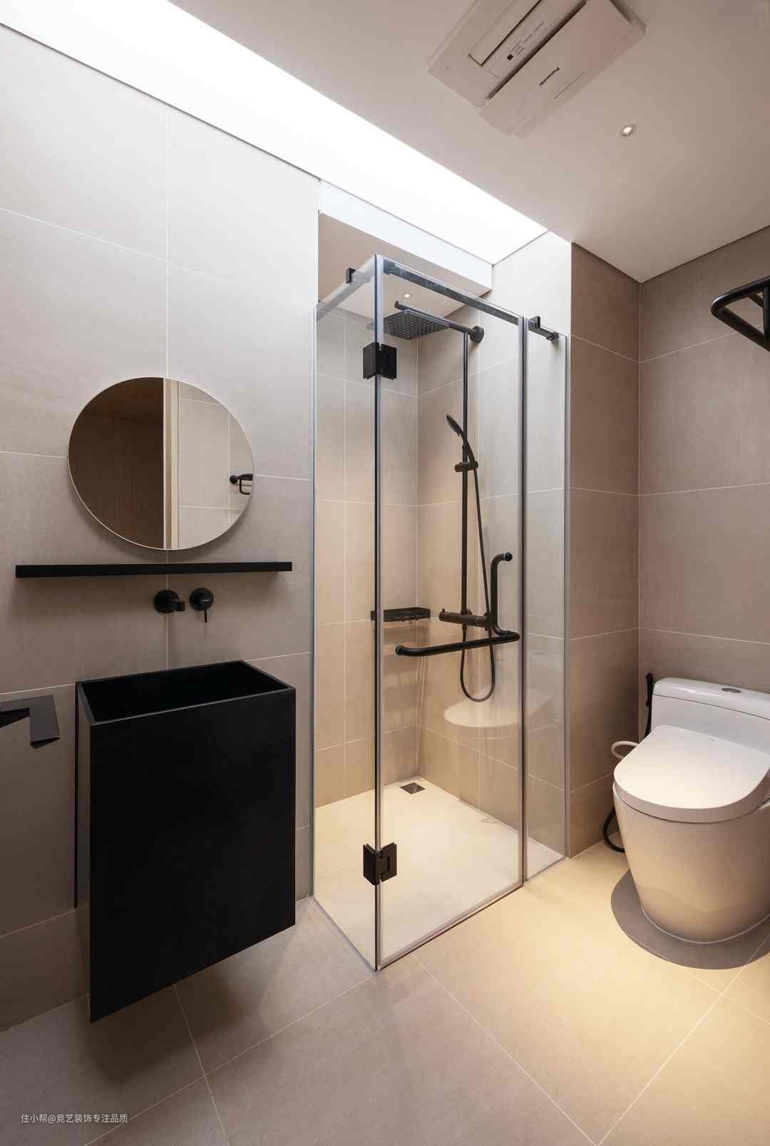 整个卫生间空间具有现代感的同时功能分明,大理石地砖通铺墙面地面,灰色系搭配黑色洗漱台不同的材质但都在一条主线上的纯色,干净的色块构成,玻璃门的隔断,干湿分离的有效结合,黑色淋浴套装,在理性与沉稳之间,由内而外彰显出空间舒适感,加上筒灯暖光点缀,智能马桶于一侧井然有序,静谧时尚的空间得以完美呈现