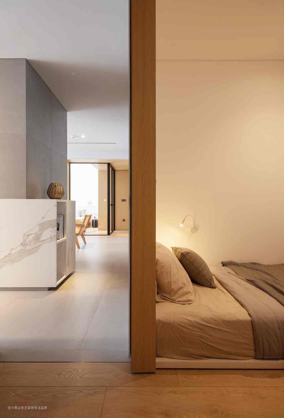 最简单的往往越高级,原木勾勒出高级感不同材质的相互碰撞,赋予另一个维度都和谐暖光壁灯入目皆温柔宁静的空间氛围丝毫没有受到不规则的影响摒弃多余装饰,用灰+白单人床营造纯净空间
