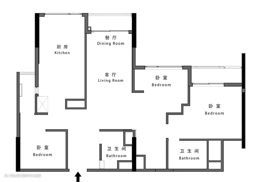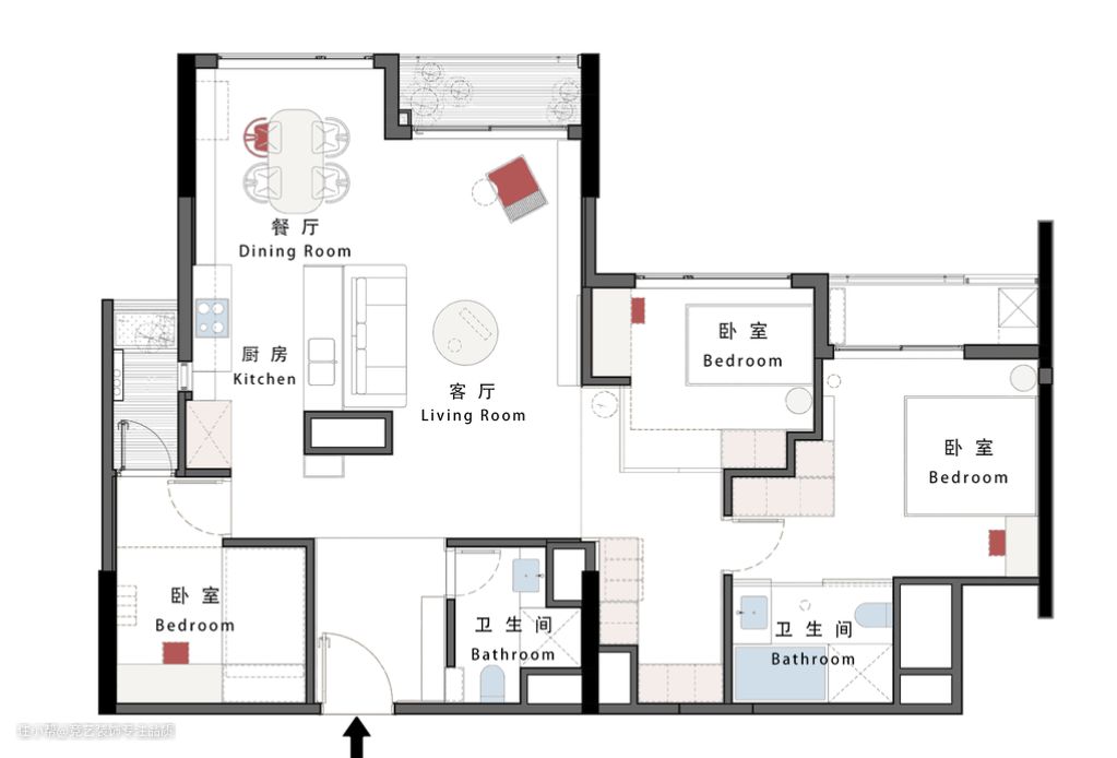 1. 拆除客餐厨之间的墙体,优化公区布局空间开阔度与视野实现效益最大化,生活动线灵活舒展。 2. 主卧作套房模式疲惫独立卫生间,浴缸设计带来沉浸式体验整体保持墙面整洁的同时增大储物面积,扩大收纳空间。 3. 两间卧室空间进行灵活分布调整,合理的规划让每寸空间都得到高效利用,主卧设计阳台规划室内采光,实现功能性与舒适性的完美统一。 4. 客餐一体+开放式厨房拓宽视野范围打造开阔明亮空间感,串联各个公区塑造家庭温情。