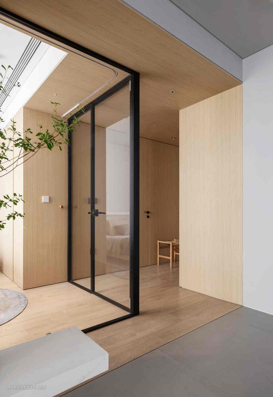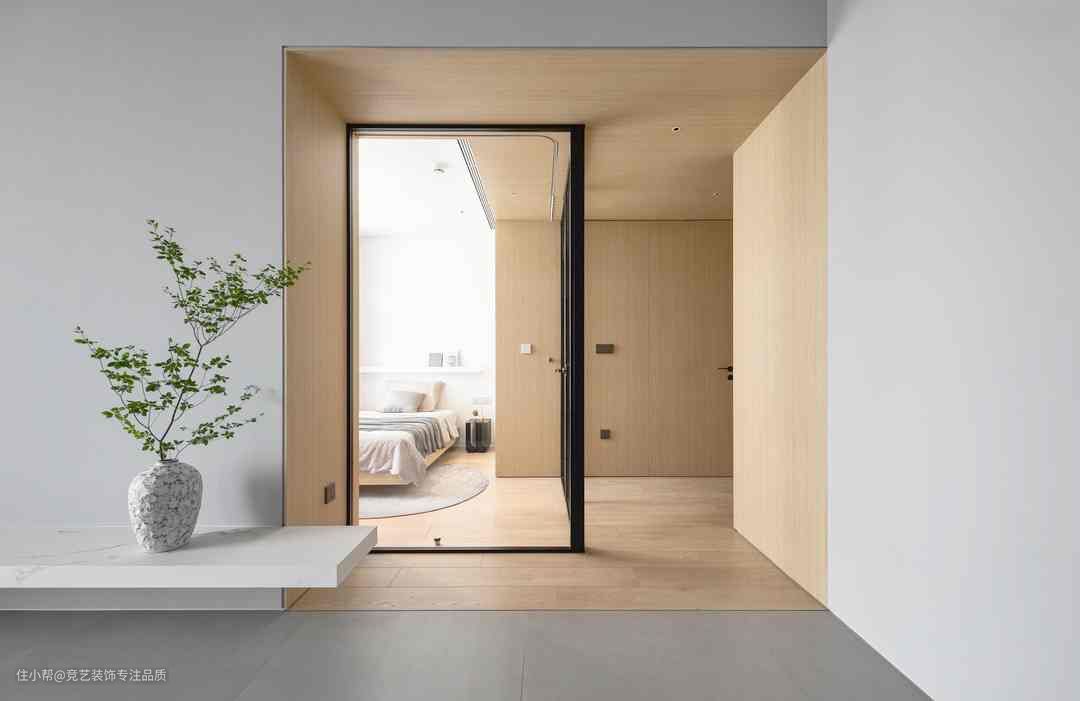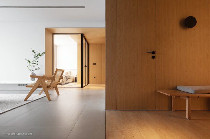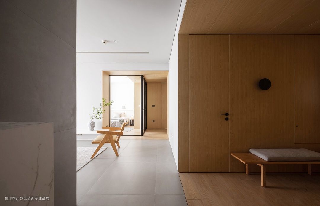 玄关是家的第一印象,空间配色以原木为主,搭配利落线条运用全包式设计融柔白色进行调和,为生活带来极致体验,原木换鞋凳靠墙放置从视觉上达到完整统一,下方悬空设计留出置鞋区搭配软垫轻盈简约的造型生活的仪式感就是在认真对待每一个细节中获得