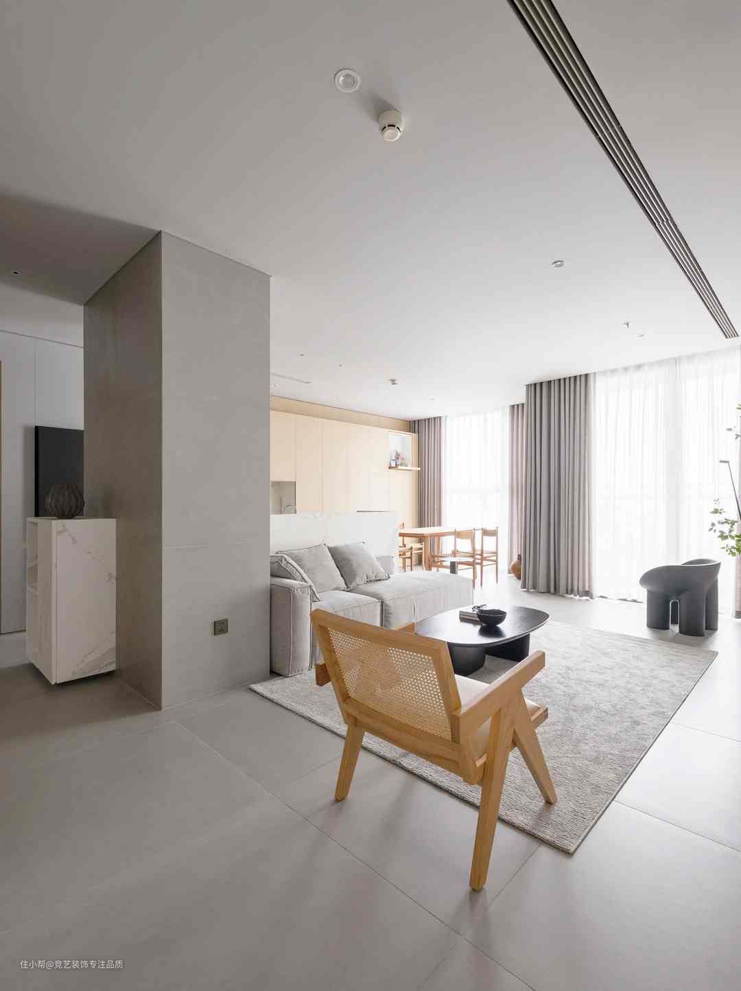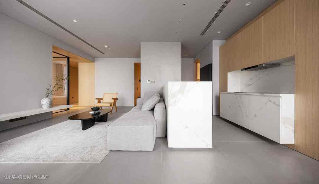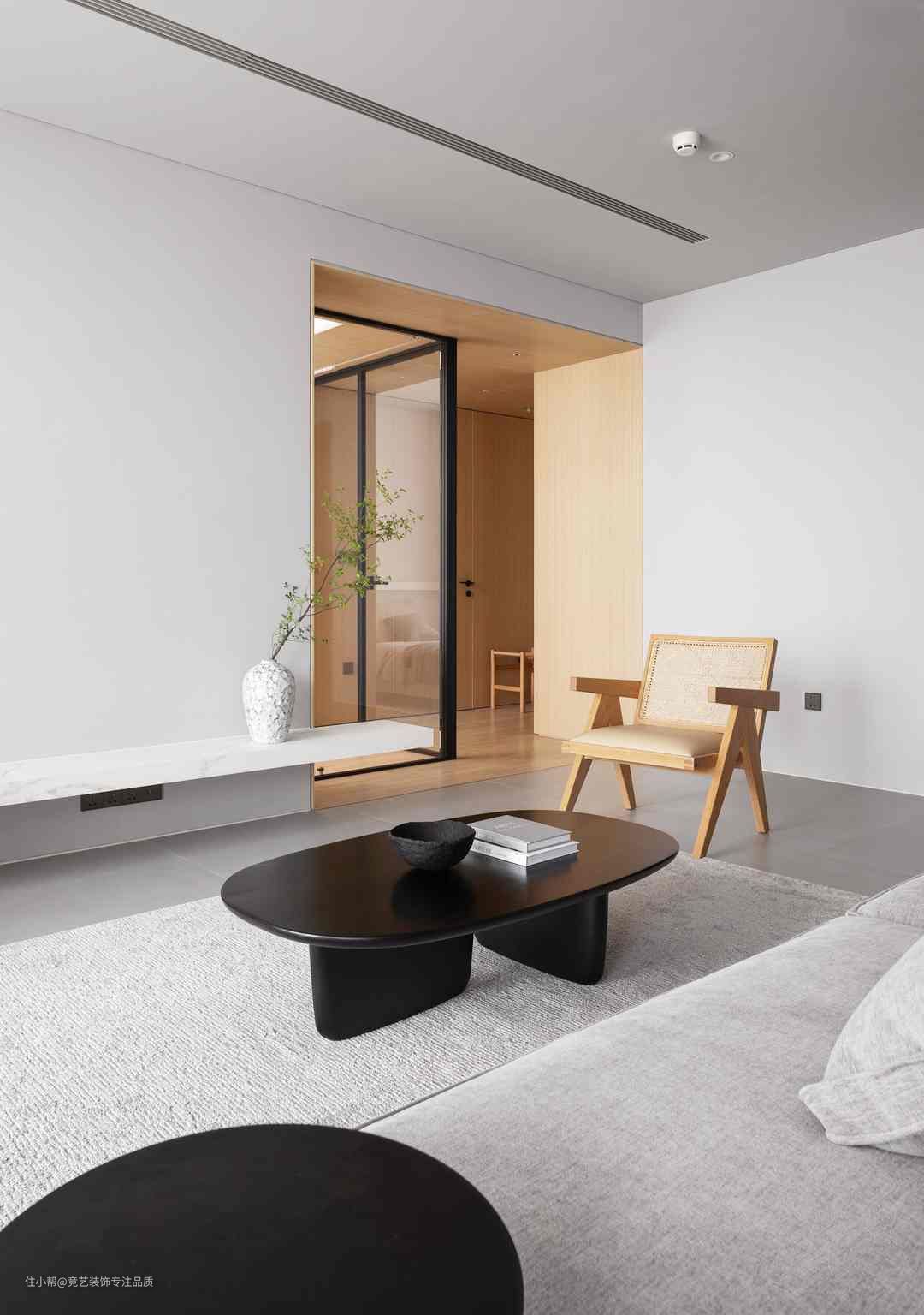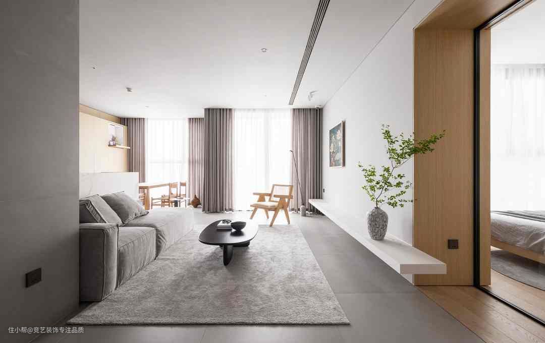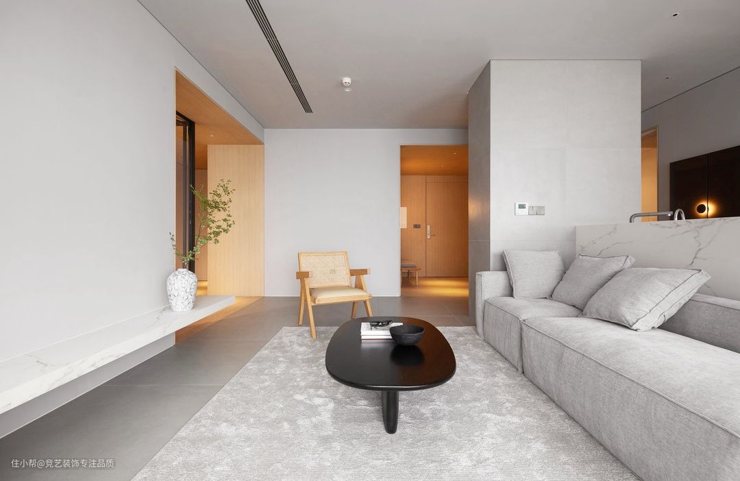 灰色长方形沙发大且软糯可供多人落座,地面铺设同色系地毯,增加地面装饰层次感,其上置放简约黑色茶几给予更大的艺术观感价值一侧置放单人椅,避免空间过于单调同时摆放上书籍点缀空间慵懒随意,去电视+留白高度遵循极简主义,大量的留白最大限度自由巧妙的将空间使用权留给屋主。同时加入绿植点缀,提升空间活力单色调构成保留了黑与白的纯粹