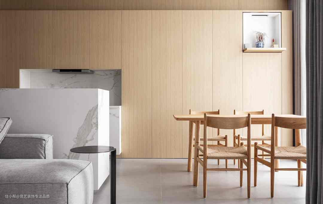 餐厅采用开放式设计,宽敞明亮,里侧整面落地窗+窗帘透光不透人,兼顾公共空间采光。里侧墙壁打造通顶柜满足餐厨空间基本收纳需求,餐桌以原木打造配备同套餐椅编藤坐垫在细节上进行呼应,壁龛式设计与餐厅整体调性完美适配,留有足够空间可随意放置收纳物品