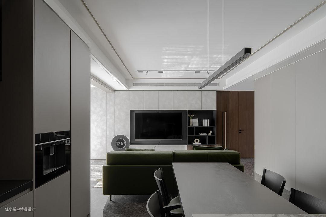 客厅以饱和度较低的色系为主,营造柔和宁静的室内氛围,选择墨绿色皮面沙发点缀,可以达到弱化灰白色的单调和冷硬感,呈现温馨舒适的视觉效果。 将阳台纳入客厅后,扩大室内面积,拉伸空间纵深感,视觉上也更加宽敞通透。阳台设置洗衣区(洗衣机+烘干机),另一侧设置实木矮凳搭配简约边几,闲雅静坐于此,尽享休闲放松一隅,丰富生活场景,赋予空间更多可能性。 电视背景墙和书房背景墙连贯,同样的色调与材质,保证空间的统一性和整体性,视觉得到更进一步的延伸。电视背景墙上大小不一的开放式储物柜,用于分类收纳。