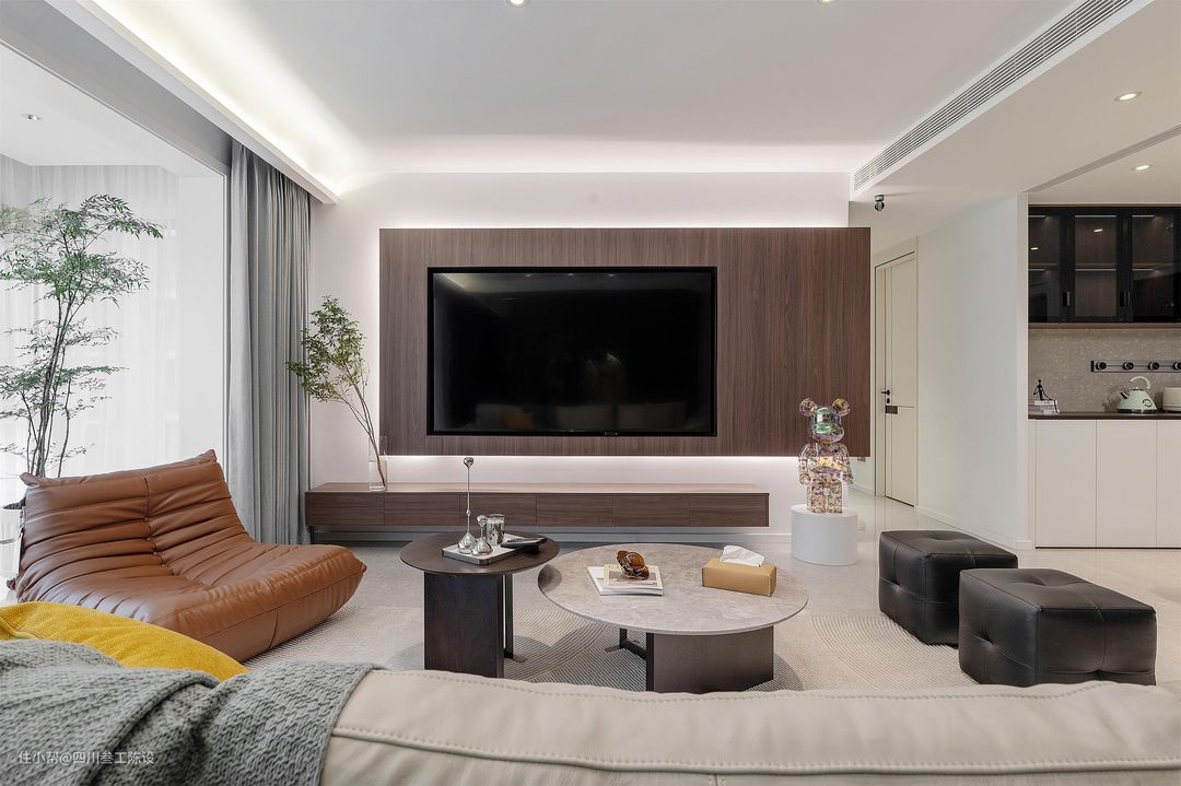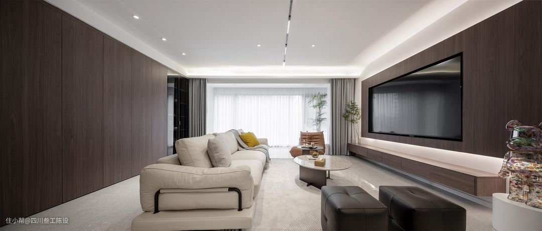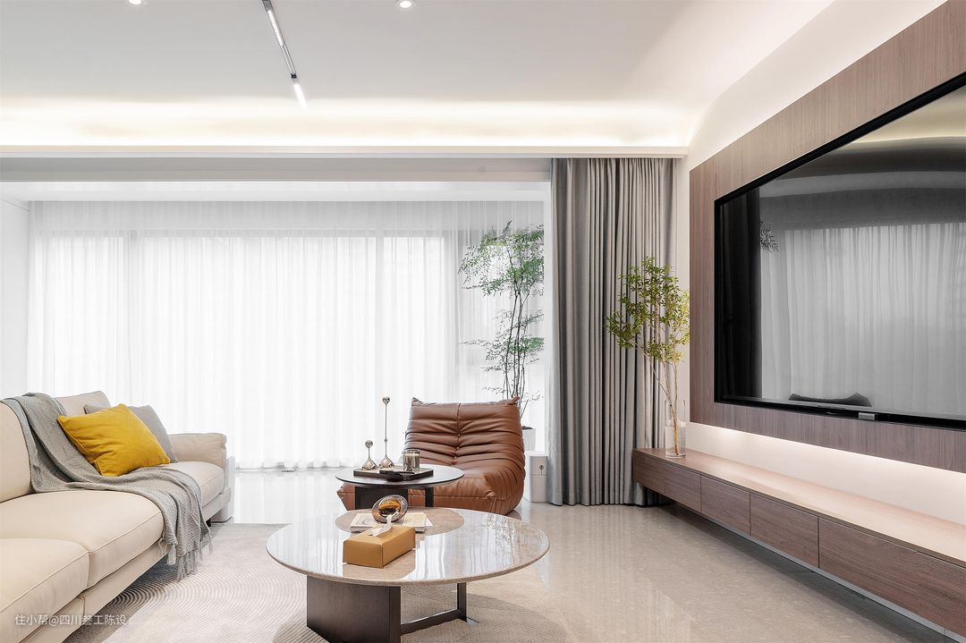 客厅的户型是比较宽敞的,可以看到,沙发后面还有一部分的空白区域可以活动,设计师不想浪费空间,所以将墙面做了定制柜,方便开合,木饰面与电视墙相呼应,空间更加大气沉稳,还方便孩子玩耍。 阳台按照现在的主流设计做了打通通铺,浅色系地砖让空间显得更加大气开阔,进深更长,落地封窗,空间通透又明亮,缓解了竖厅客厅的采光问题。 户主比较重视观影效果,想要一个较为昏暗但不伤眼的观影空间,因此设计在落地窗与阳台垭口处都安装了窗帘盒,一层纱帘透光不透景,一层遮光帘专门遮光营造空间氛围。 顶部安装双层藏灯吊顶,增加氛围与层次感,整个空间做无主灯设计,加强客厅的整体照明,光照无死角,同时视觉上也十分简洁大气,中间的磁吸轨道灯还有分割空间,扩大视觉效果的作用。 从这个角度是可以看到设计师虽然安装了灯带,但和普通的灯带设计不一样,设计师在两个灯带的交接处做了一个偏弧形的设计,且阳台垭口的灯带明显粗一些。 背景墙是简单的白色乳胶漆通刷,大方明了,久不开裂,很容易出效果,电视墙和电视柜都使用到了木饰面,但做了不对称的设计,加上电视墙后方的灯带,空间层次感十足,设计感还强。 墙面还有一些空白的地方,设计师选择点缀上清爽的绿植与摆件,留白适中,空间既不会显得空旷单调,也不会显得过于饱和复杂,底部留空方便扫地机器人出入清洁。