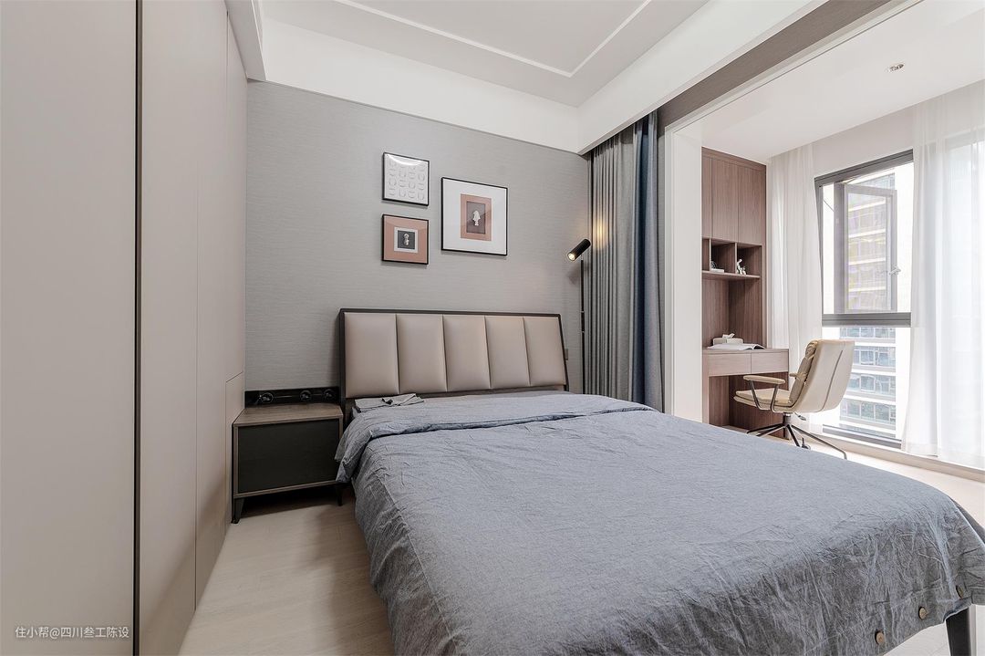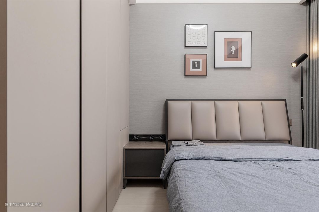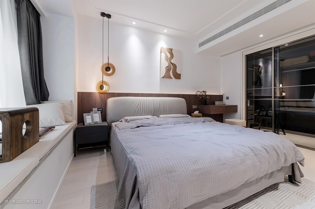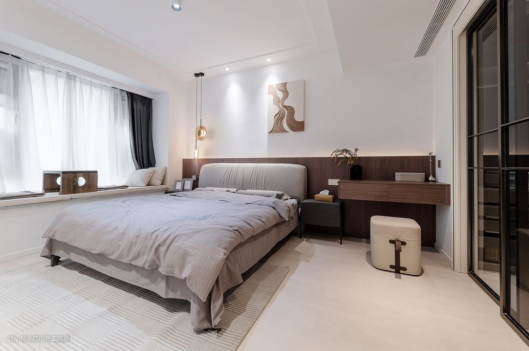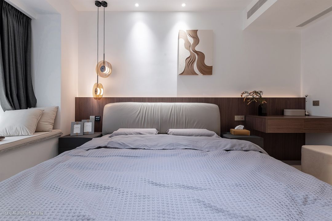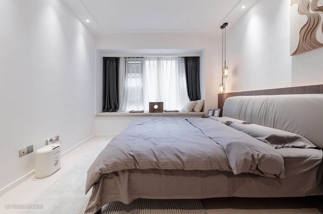 主卧的整体空间还是比较宽敞的,不过侧面窗户的飘窗还有户主想要安装衣帽间的想法让这个房间的可操作面积变得小了一些,因此设计师想将飘窗给利用起来。 思考后,设计师按照户主的生活习惯等在飘窗上放置了两个坐垫和一个小茶几,方便小两口平时聊天喝茶,同时侧面加了几个靠背,增加舒适感。 床尾和床头都安装了许多插座,方便日常电器使用,避免后期电器增多没有地方使用的尴尬处境,情面用简洁的白色乳胶漆通刷,简洁大气还耐看,同色踢脚线也不会显得突兀。 地面统一使用了白色的木地板铺贴,结实耐用,颜色百搭,和空间风格也比较符合,床下还铺了一张浅灰色地毯,比较耐脏不显突兀,同时增加舒适度和温馨感。 床头简单的白墙会稍显单调,层次感和档次都会较差,因此设计师在下面半截使用木制的半墙护墙板做了分色处理,后面加了灯带,空间质感一下就上来了。 同时方面还挂了一副装饰画填补留白,左侧的灯也改为了一个可调节的吊线灯,错落有致的造型和柔和的光线不仅实用性墙,在颜值方面也十分给力。