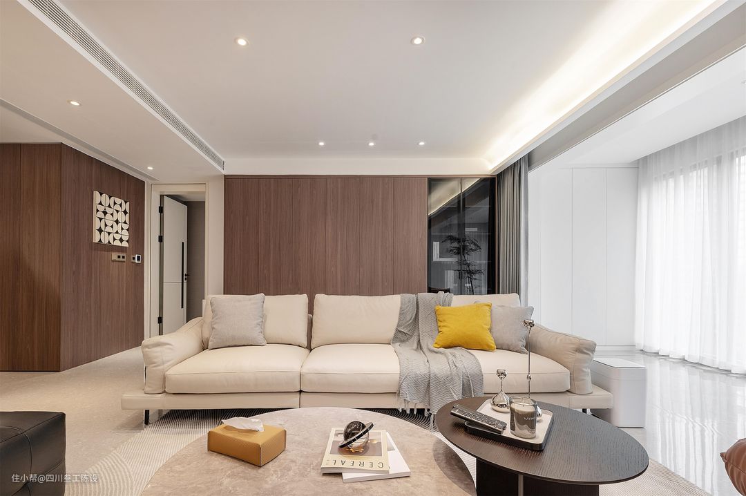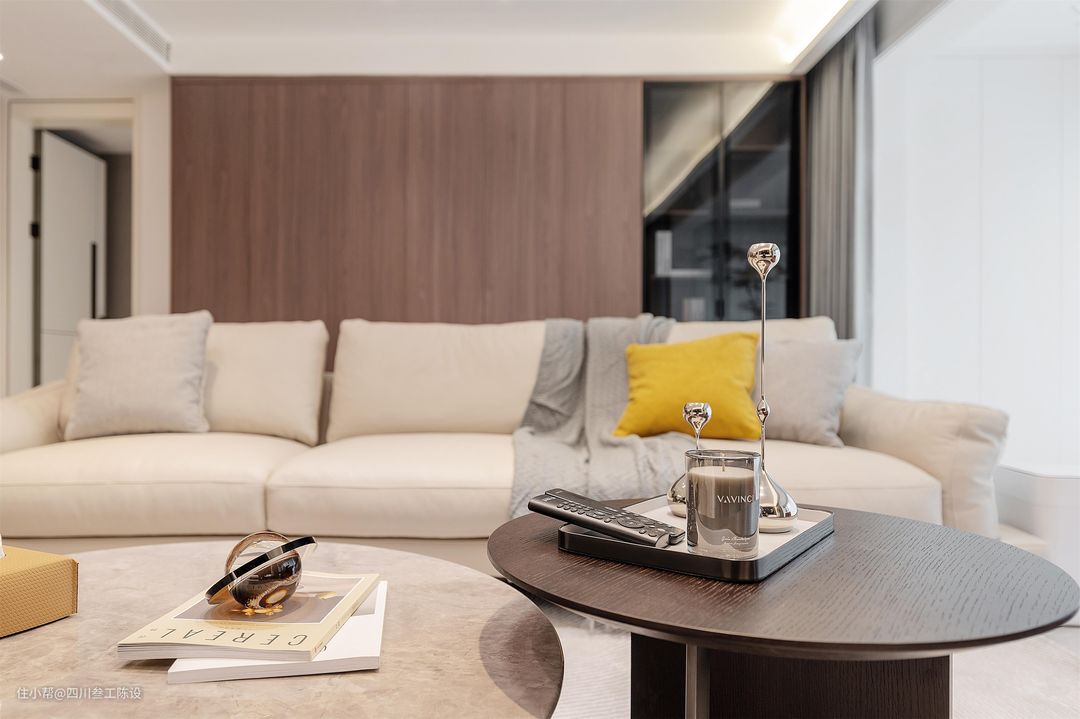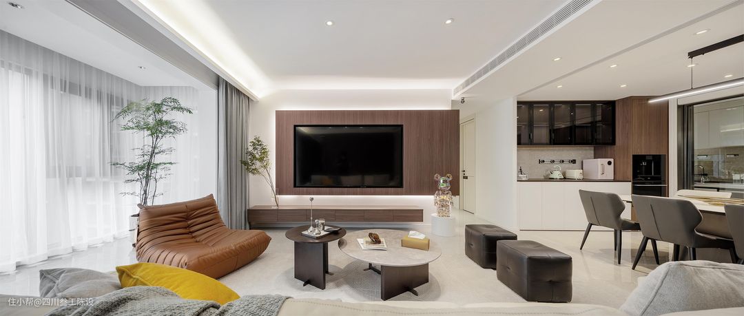沙发整体进行围合式布局,两侧分别放置了懒人沙发和沙发凳,随时可以感受柔软放松的感觉,家里客人多的时候也有地方可以坐和休息,中间的茶几用两个圆形小几做搭配,与空间融合度高。 沙发的造型与颜色秉持着空间的简约主义,选了一款大气简洁的白色皮质沙发,座深较长,扶手较低,坐卧十分方便,更能带给人舒适放松的感官体验。 包容性比较强,上面加任何纯色抱枕都显得十分耐看,即使是比较耀眼的黄色也不会显得出挑。后面的墙面做了木饰面的定制柜,右侧空间和阳台垭口的区域也没有浪费,同样做了立柜和展示柜增加储物空间。