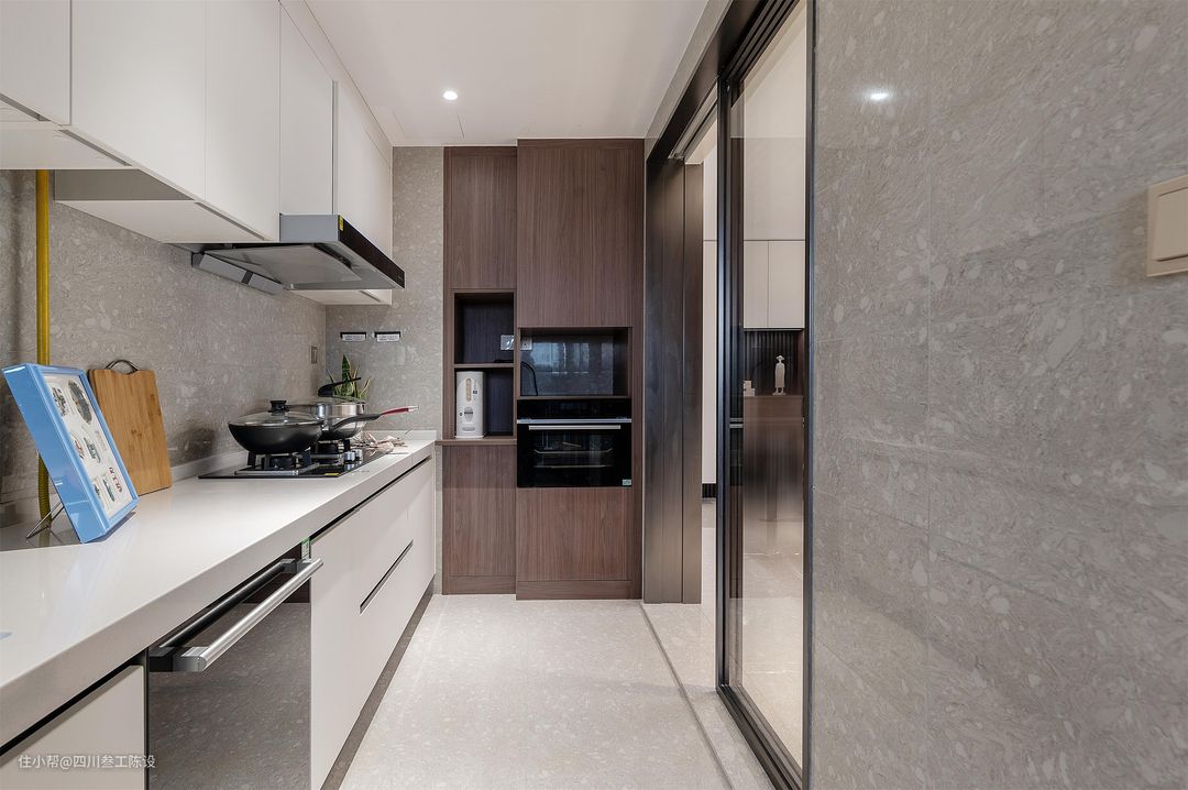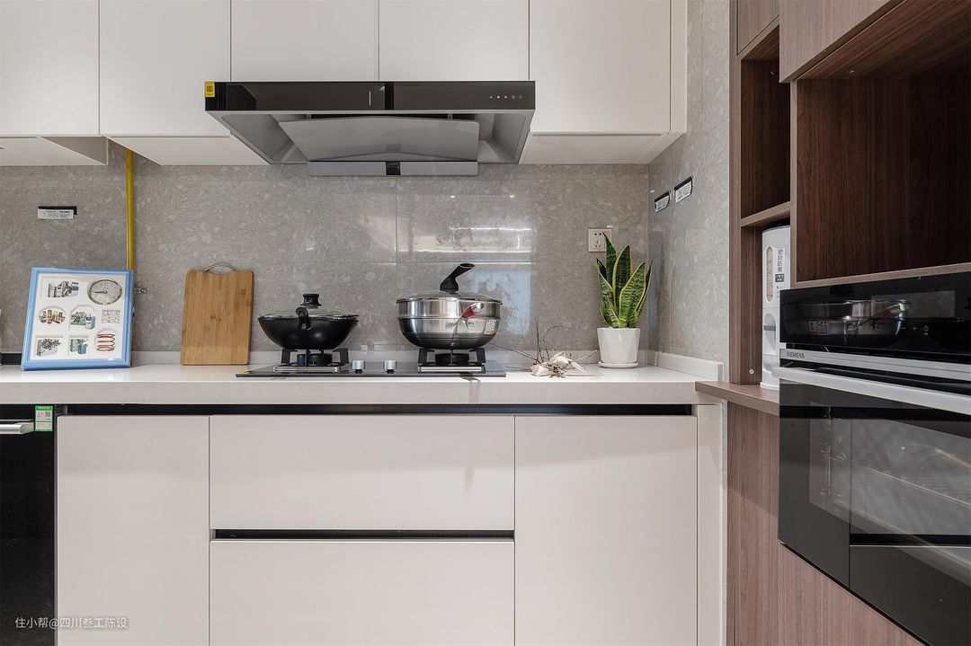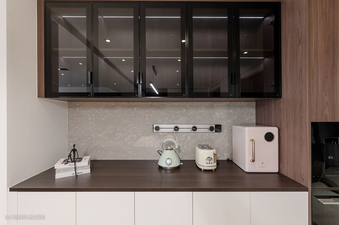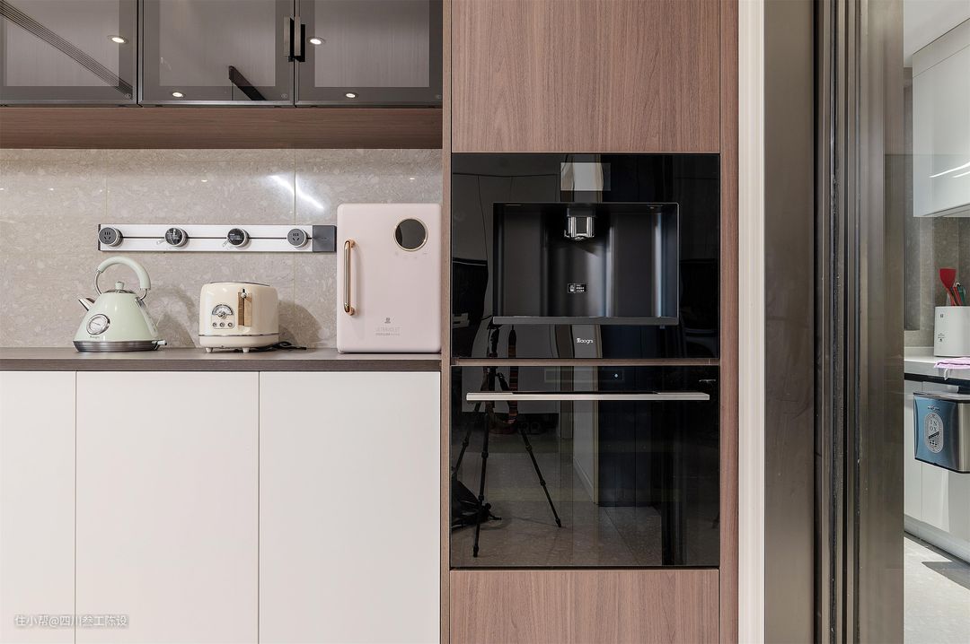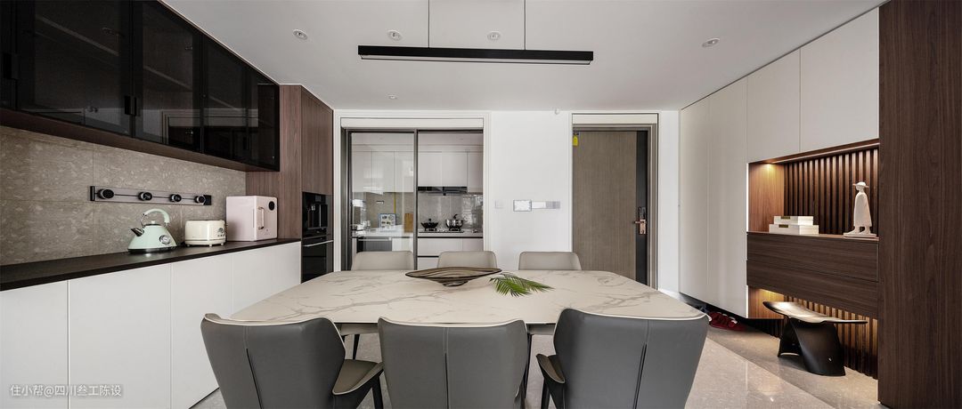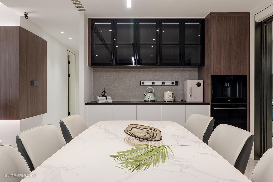 餐桌选用了一张六人方桌,一家人使用绰绰有余,岩板餐桌结实抗压,还耐高温,高密度让它不怕油污浸染,打理起来也十分方便,和皮质餐椅搭配,十分凸显质感。 另一边墙面安装餐边柜,上方装透明柜门,用来放置各种厨房用品或者摆件,下方装白色柜面,无把手设计大气简约,中间的放置区则安装有可移动插座,方便电器使用。 右侧的木制柜做了顶天立地的设计,因为厨房较小,所以将一部分的厨房电器放在了外面,电器嵌入,节省空间,看着也更加简洁美观。