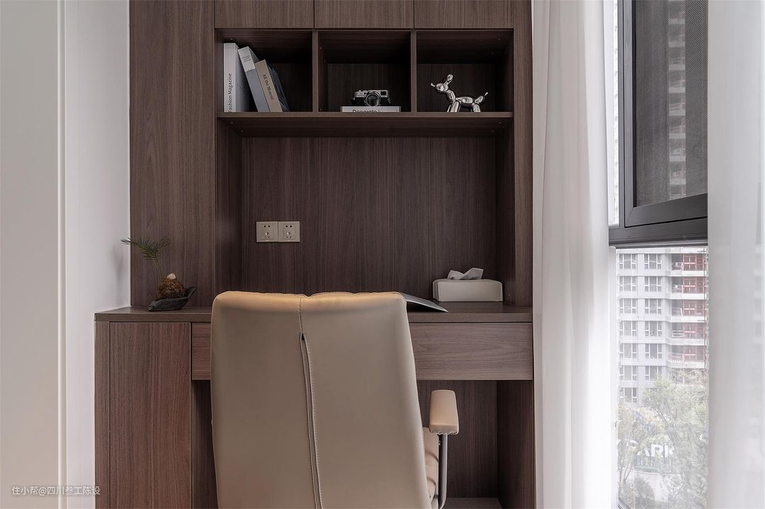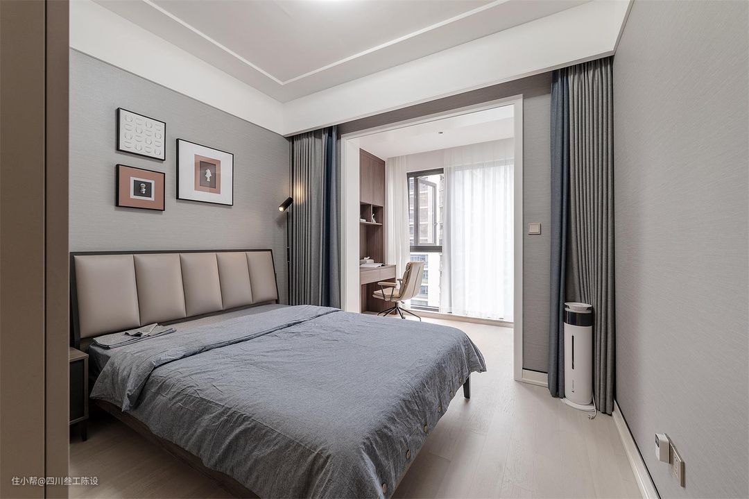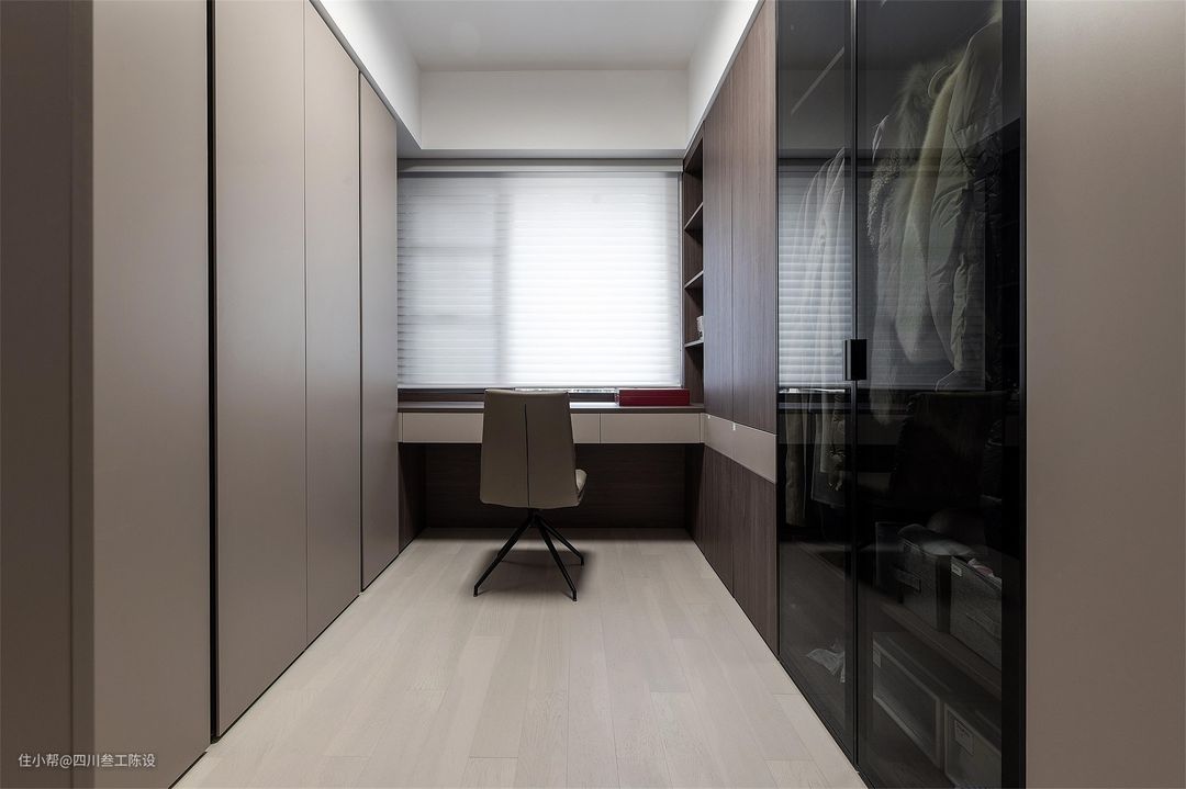 还有一个独立的小空间,设计师结合户主的需求,打算将书房和衣帽间的功能进行结合,增加空间的实用性。依旧是简洁大气的平面吊顶,地面沿用了其他房间的设计。 两侧同样安装了顶天立地的定制柜,无把手设计大气简约,同时柜面选择了沉稳耐脏的灰色,45°斜切边使得衣柜开合自如,中间还用黑色的透明柜门做了挂衣区。 里面的书桌做了一个L型的穿插设计右侧与桌面都使用了木质板,气息清爽自然,办公环境更加宁静舒缓,搭配透光不透景的百叶窗,实用性不俗且十分大气美观。