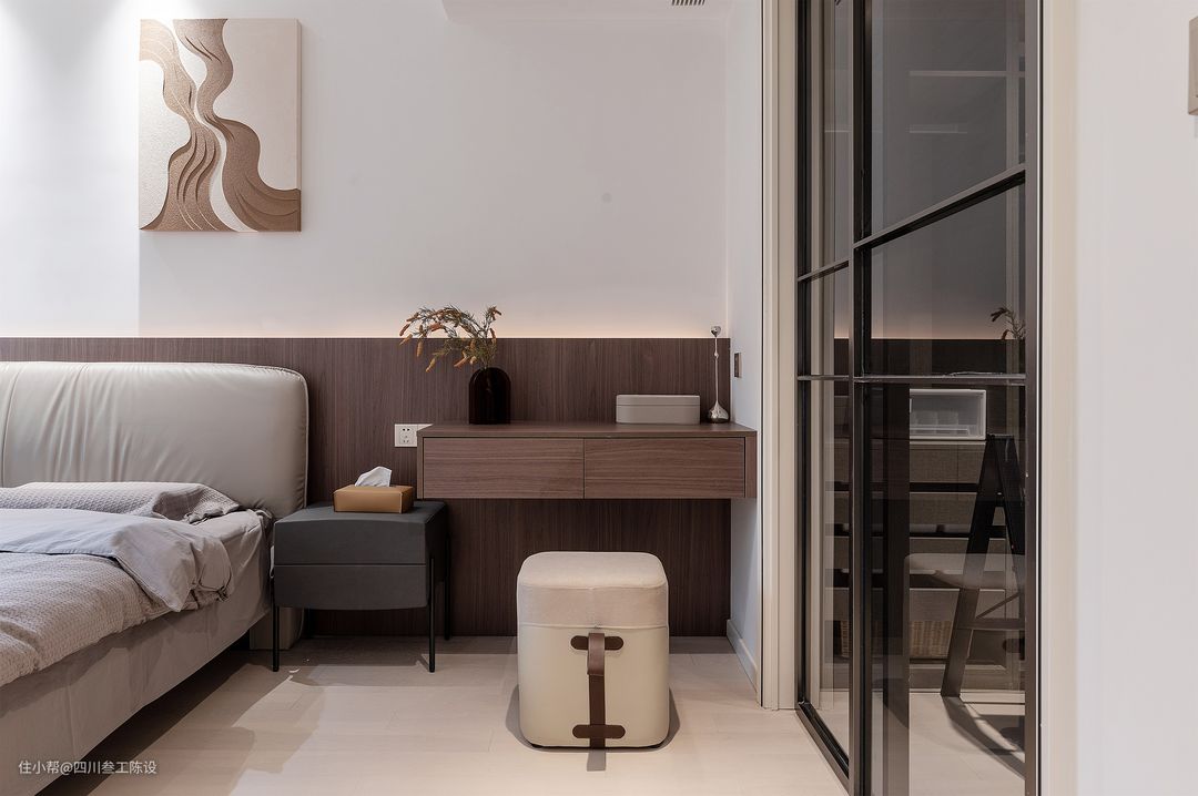 右侧的衣帽间安装黑色玻璃推拉门,里面按照户主需求设计,开放格合理规划出挂衣区和叠衣区,下面还留出空间方便收纳大件物品。 考虑到户主想要衣帽间和梳妆台的需求,设计师将床尽量靠窗摆放,增加床右侧的空间,两侧床头柜选用沉稳不易出错的黑色的方正款,简洁大气。 剩余空间则安装了木制小桌,下面收纳,上面做梳妆台使用。矮凳选了一款可以打开的,方便收纳杂物,平时不用就收入桌下,后面的带子方便拉出。
