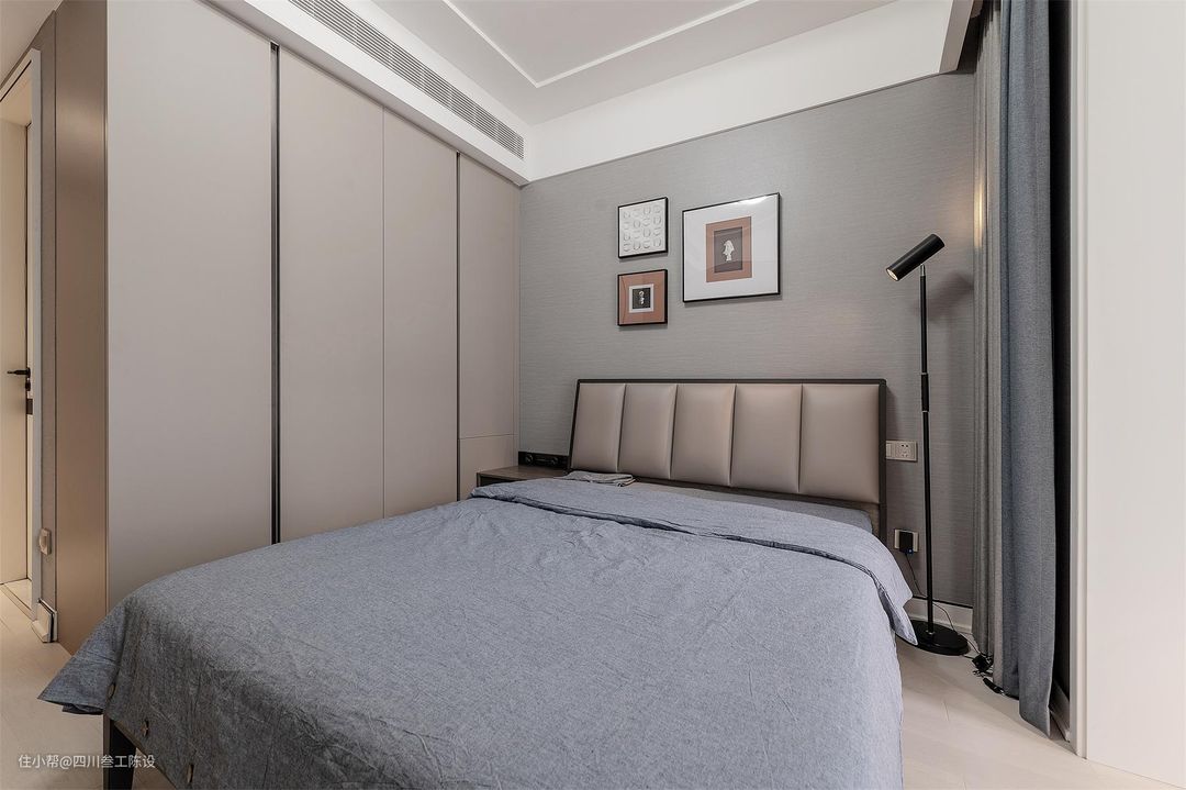 户型上这间卧室带有一个小小的阳台空间,设计师将这个空间做了打通通铺,增加空间面积,同时安装落地窗加强了空间的采光,空间更显明亮宽敞。 因为是孩子的房间,墙面用的比较耐脏百搭的灰色,同时挂了一些装饰画减少单调感,同时床头和床头柜也使用了颜色相近的灰色床头柜,大气简约舒适度高。 吊顶没有什么多余设计,简简单单的设计有着简约的大智慧,与吸顶灯组合,空间更是明亮简洁,侧面预留出窗帘盒,隐藏轨道,美化空间,同时为良好的睡眠环境做铺垫。 床侧安装了到顶衣柜,顶天立地的设计收纳十足,灰色柜面耐脏耐磨,同时为了美观度和便捷度,设计师选择了在柜门边做45°斜切,开合更加方便。