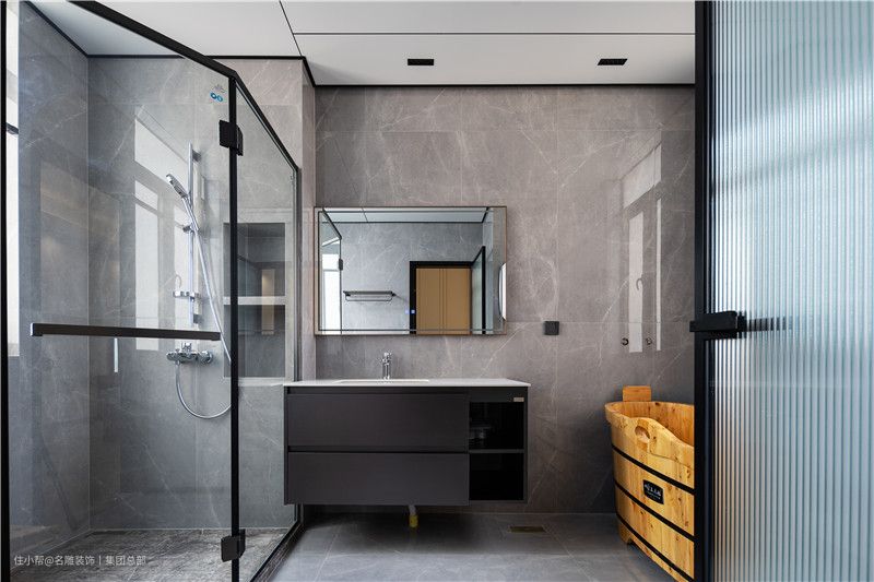 卫生间采用了灰色的瓷砖和白色的洁具,营造出简洁、干净的感觉。卫生间中还摆放了一些中式植物和摆件,增添了一些中式元素。