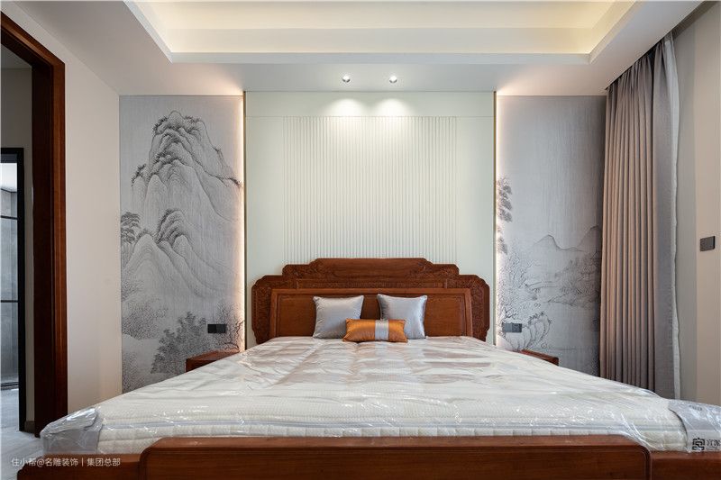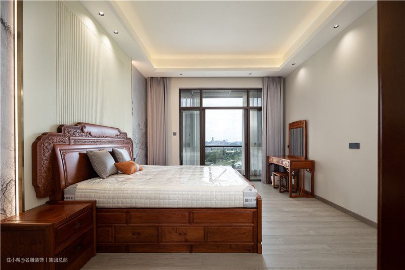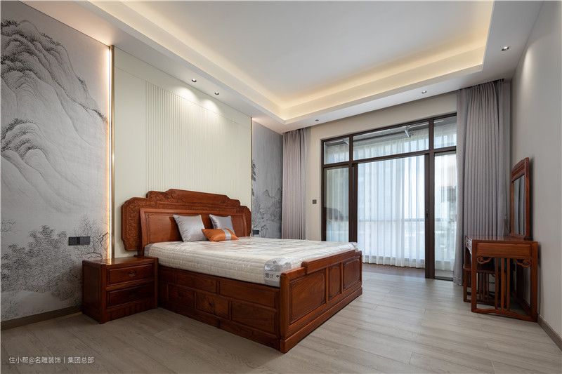卧室以淡蓝色为主色调,给人一种宁静、舒适的感觉。床头背景墙上挂着一幅花鸟图,增添了中式元素。实木床、床头柜和衣柜与整个空间的风格相呼应,使整个卧室显得和谐统一。