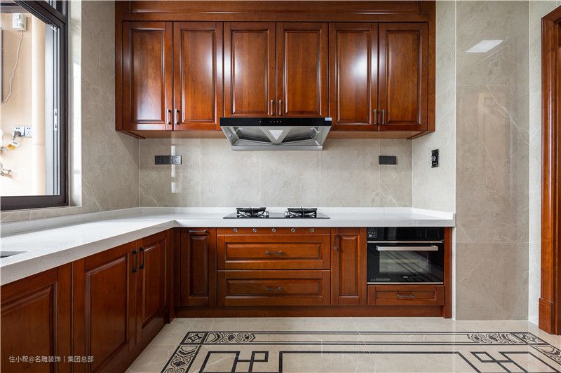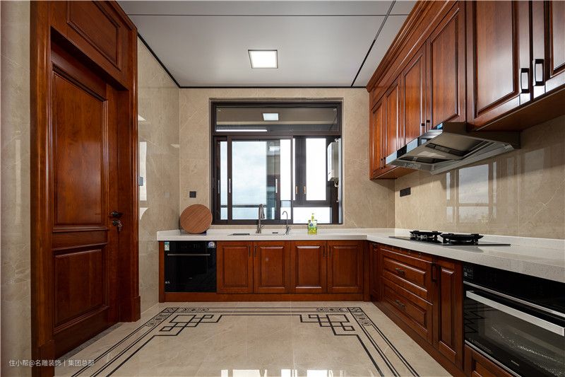 厨房采用了开放式设计,与客厅相连。白色的橱柜搭配着深色的台面,简洁而时尚。厨房中还使用了一些中式厨具和餐具,体现了新中式风格的特色。