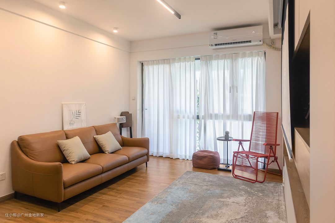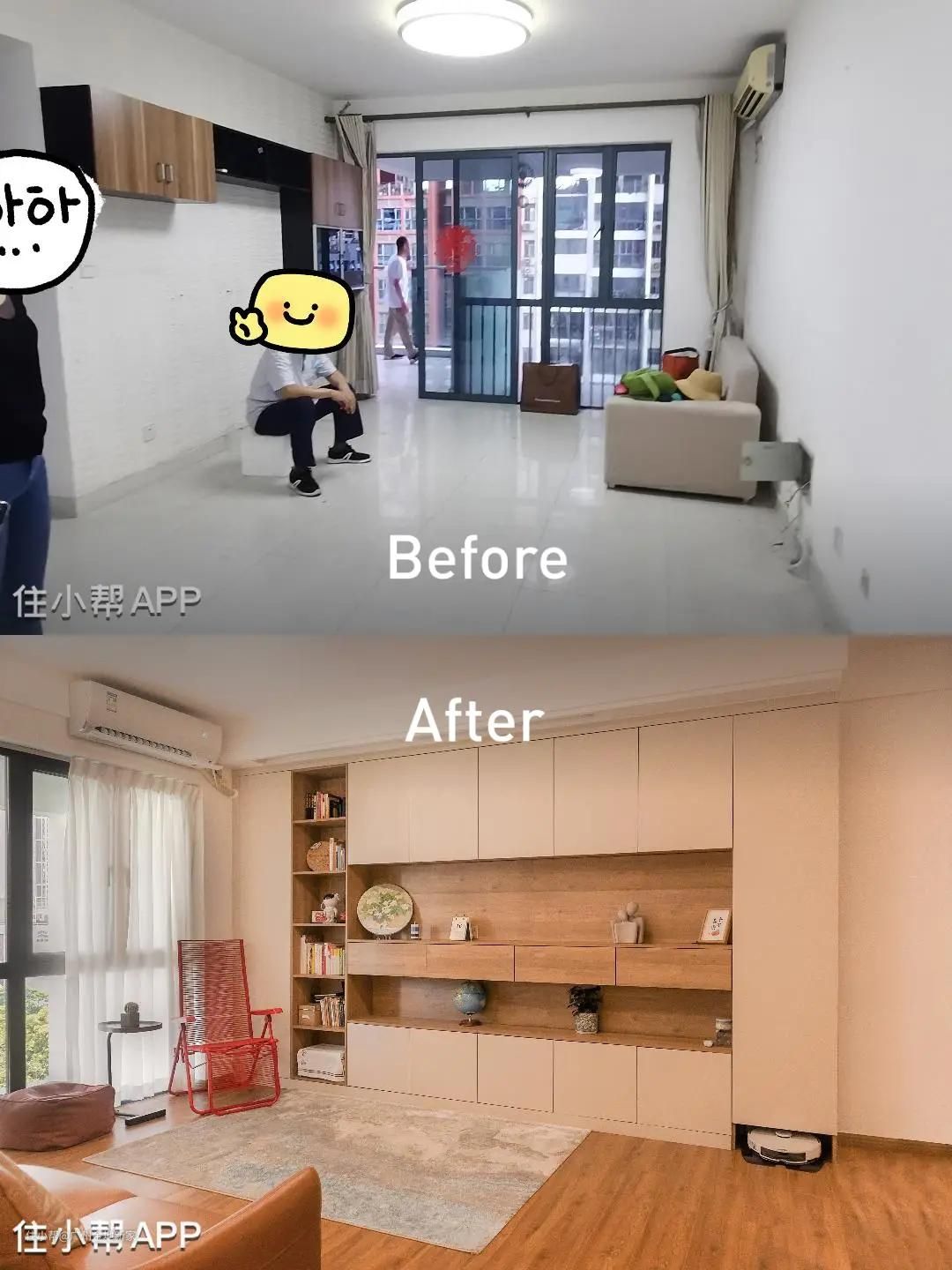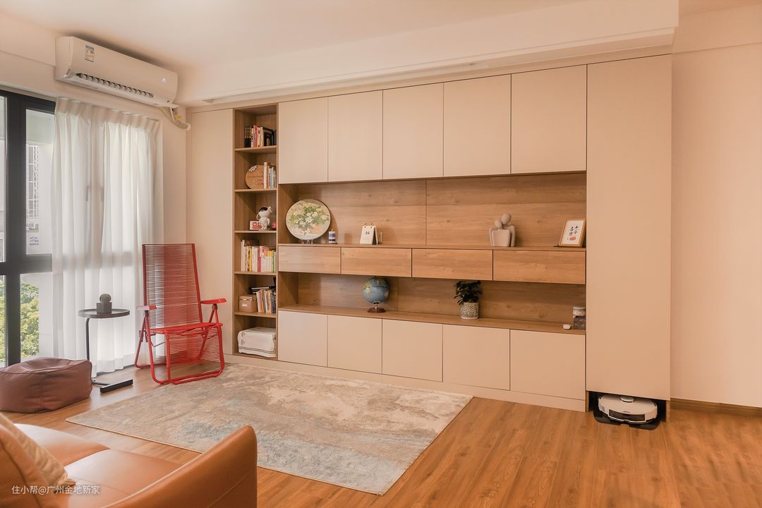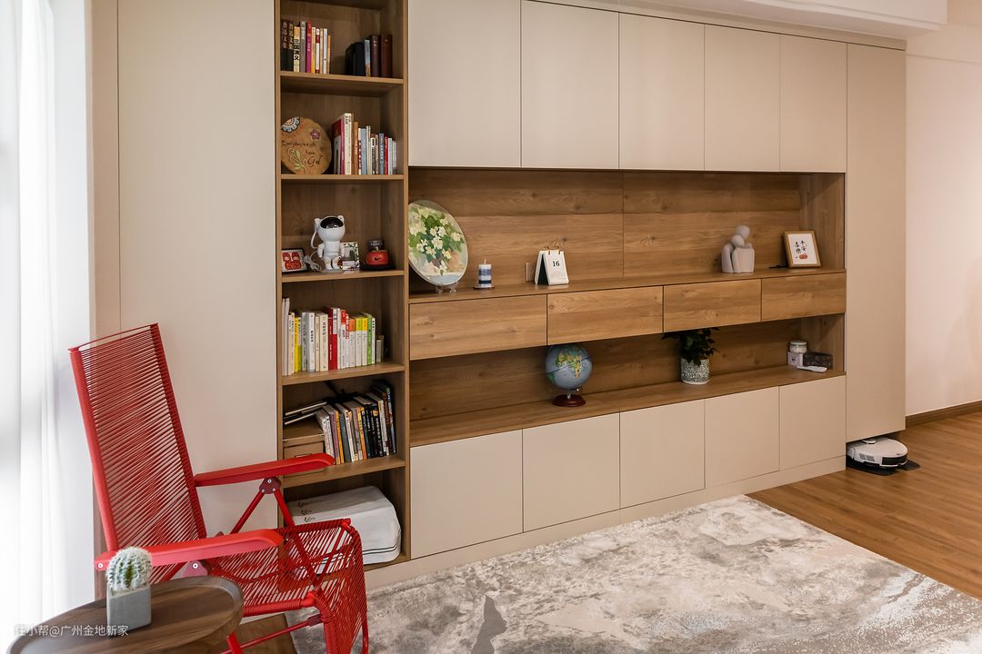在相比原始户型的结构设计,电视背景墙的朝向进行了更改,原始朝向背光较暗,更改后,能够让阳台光线更加自然的照射进屋内,减少空间暗区,整体通透明亮。 改动后的客厅空间十分宽敞,高光白的墙面和天花板也在视觉上将空间放大,整面通顶的收纳柜也得到了很好的装饰和收纳效果,客厅变成了多用化的空间。 屋主的家中没有选择传统的电视机形式,而是用收纳隐形投影幕布在吊顶中去代替,平时休闲看电视电影仿佛置身在电影院中,不用的时候收上去客厅又变成了书房,空间功能的实用性很高!